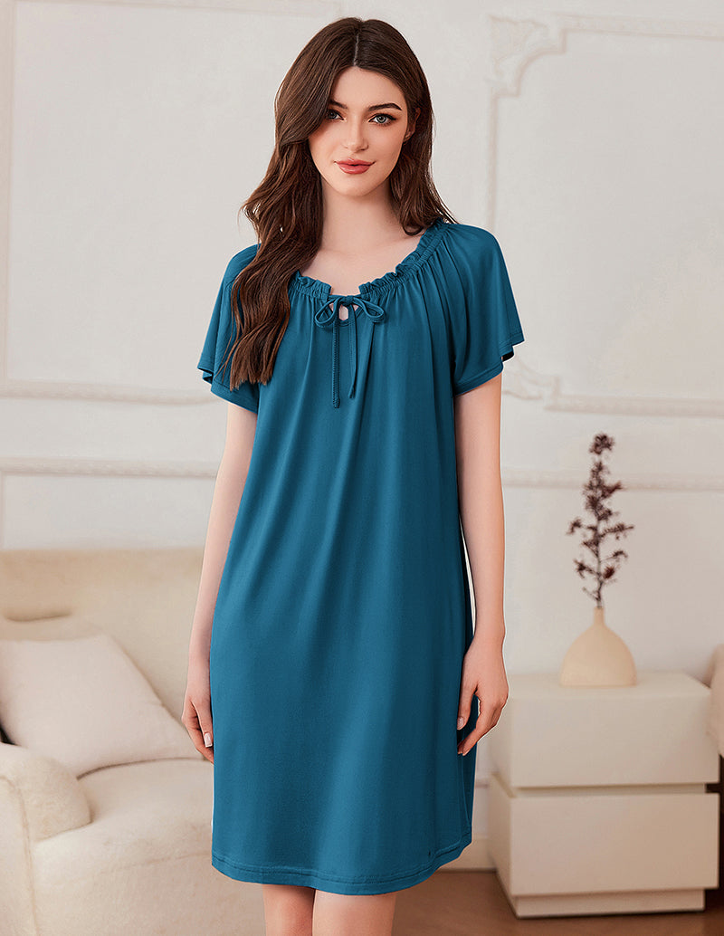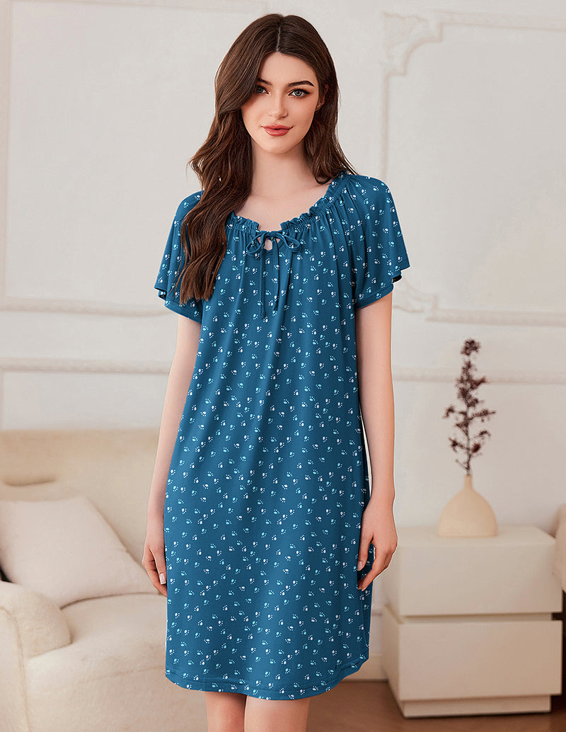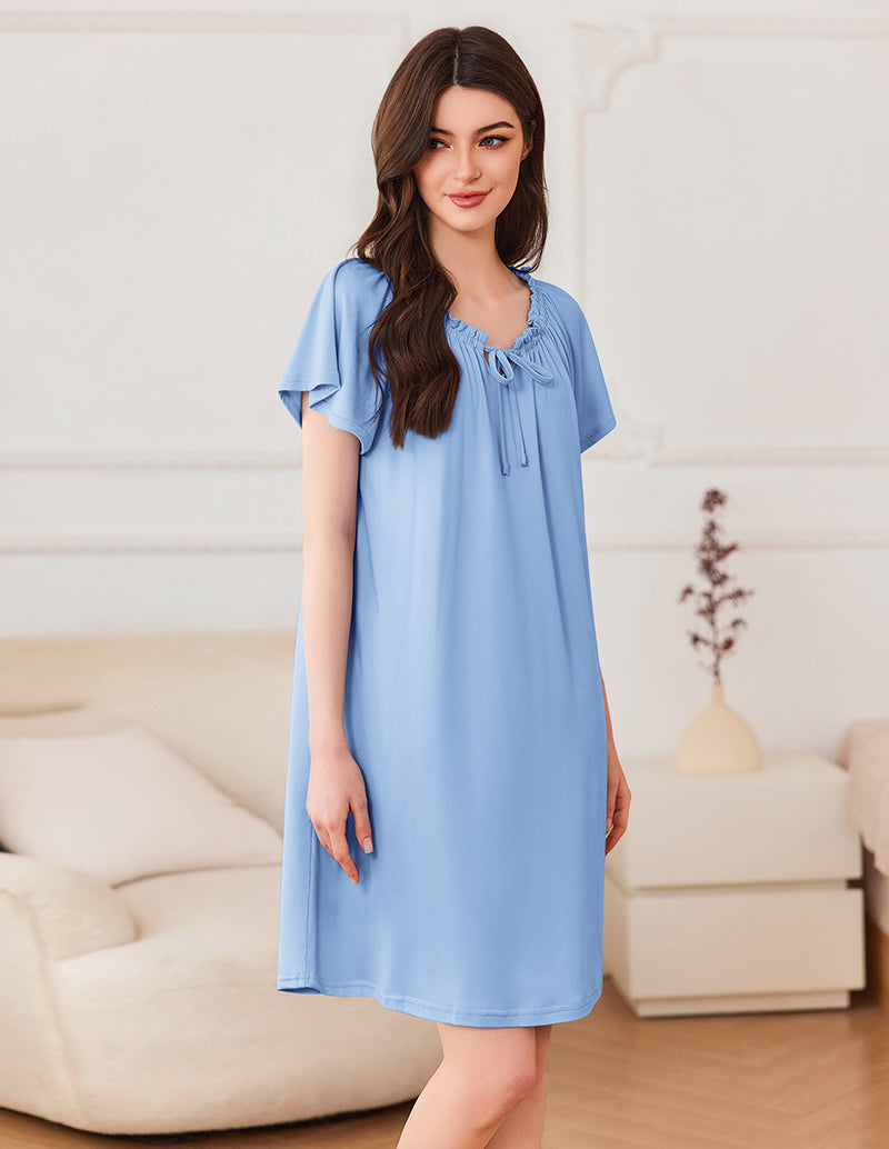 Elastic Scoop Neck: The ruffled and pleated detail and bowknot on the neckline makes it stand out. It has elastic so it is very easy to slip in and out of the garment, very cute and comfy, roomy without looking baggy. With a slip or a bra could be a cute dress to wear out, making it a summer lounge dress or a chic coverup for summer hot days
