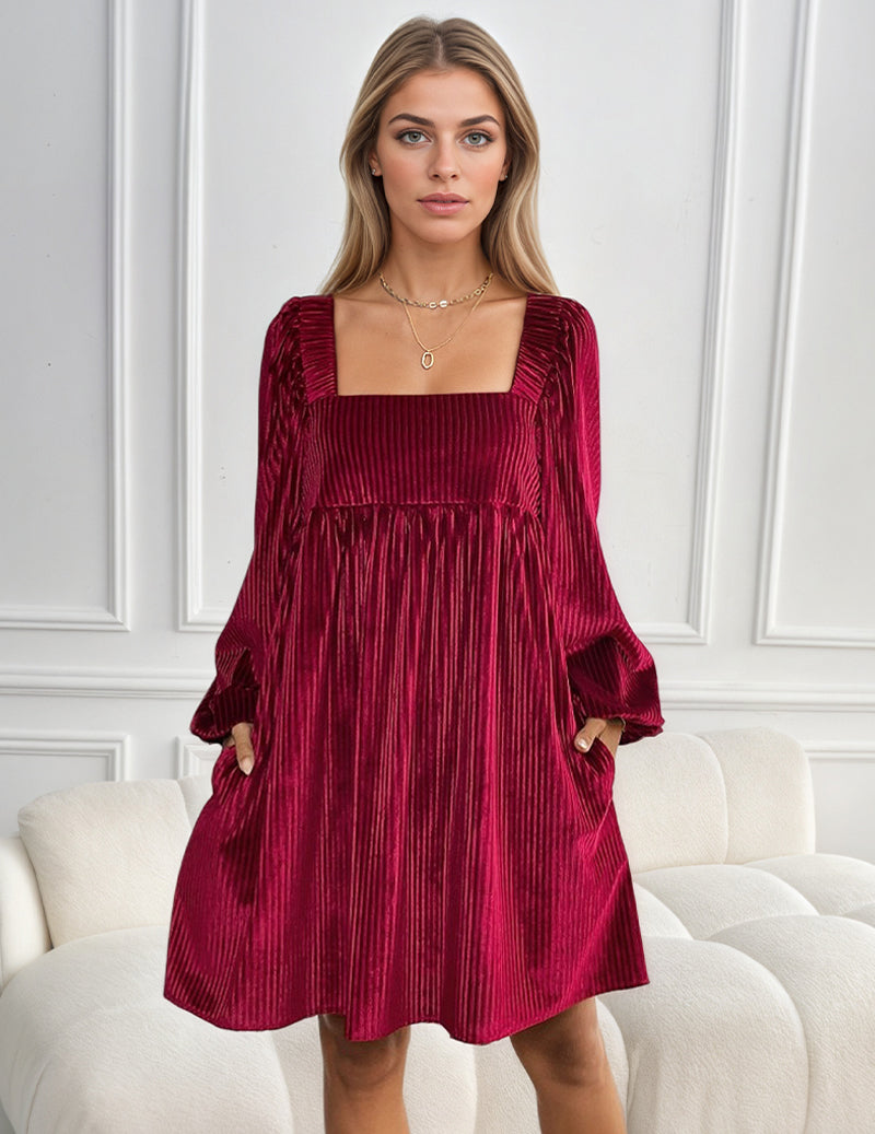 Feature: Square neckline. Long sleeves. Open back details. Side pockets. Corduroy fabrication. Mini length. Relaxed fit.