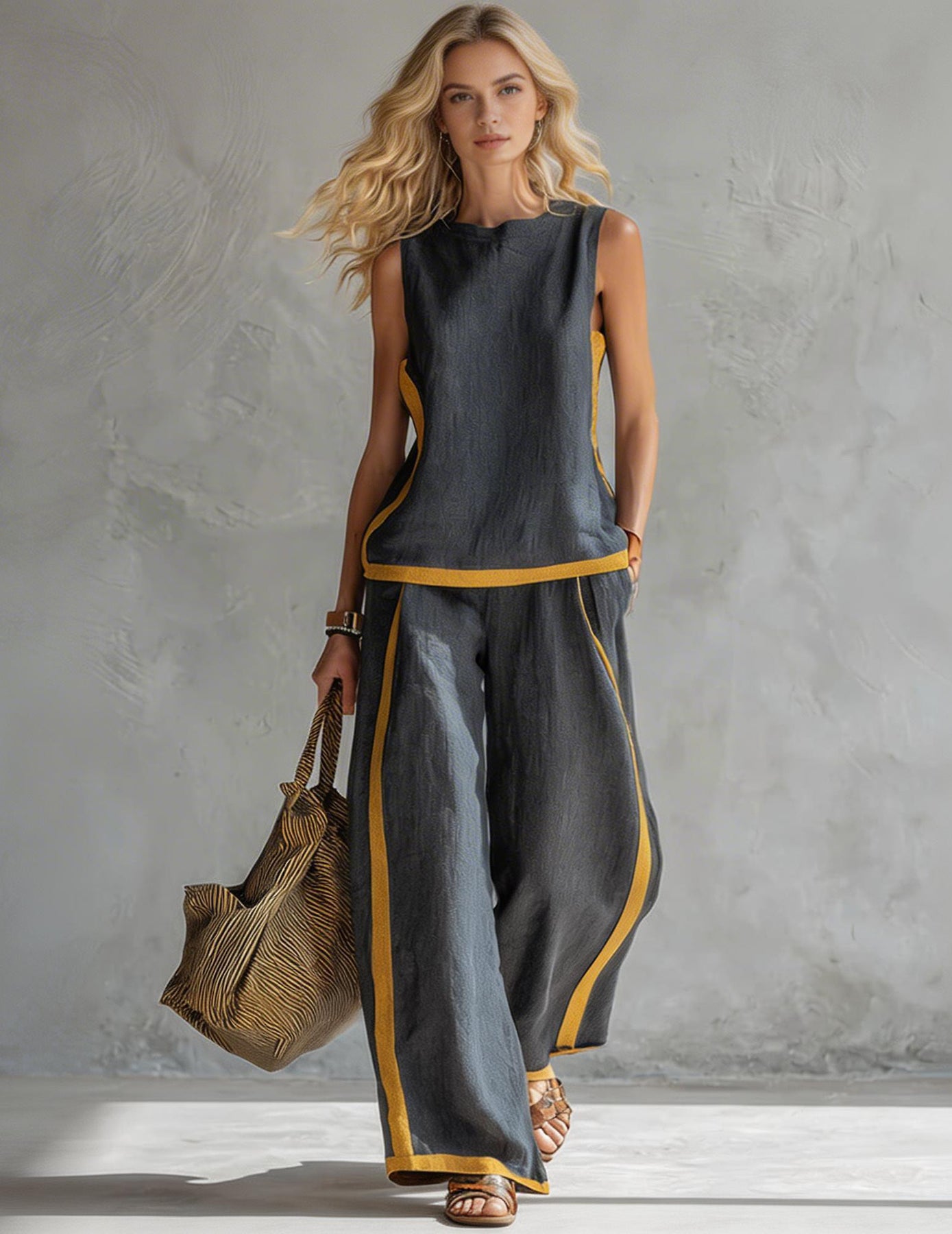 Contrast Trim Sleeveless Top and Wide-Leg Pants Set