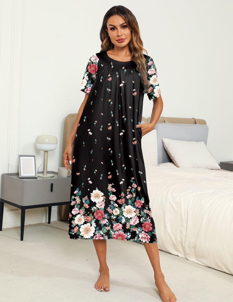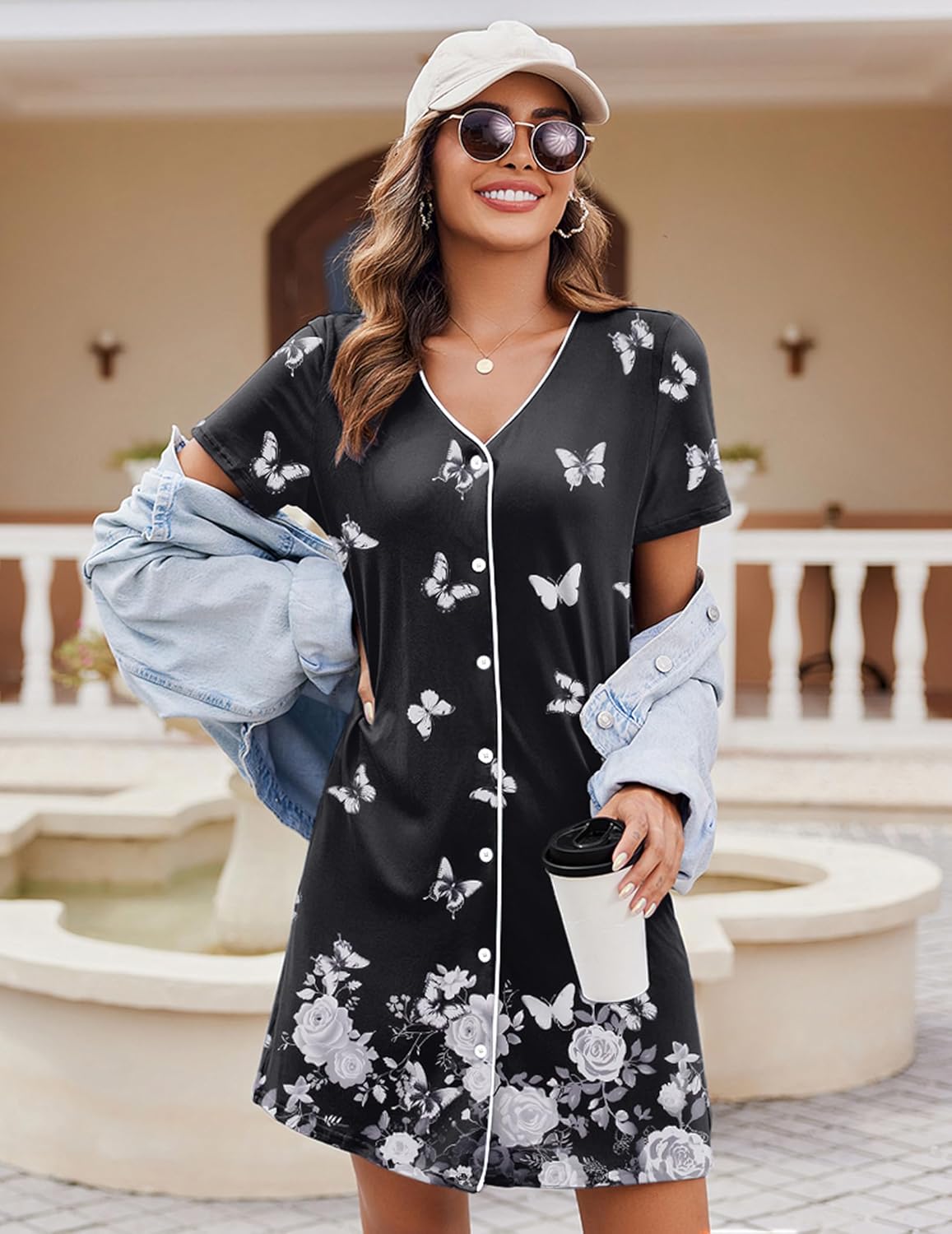 Short Sleeve Floral Nightdress Button House Dress with Pockets