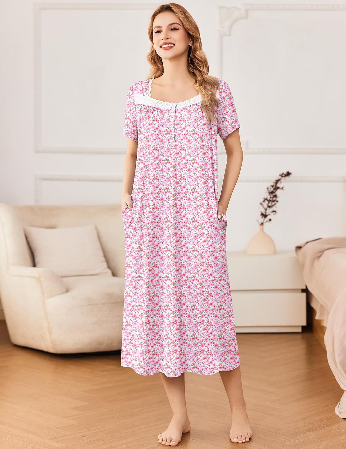 Cotton Long Night Gown Short Sleeve Nightdress with Pockets
