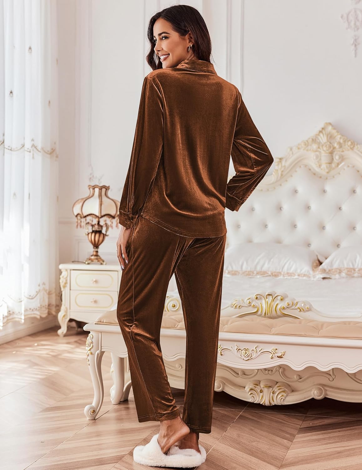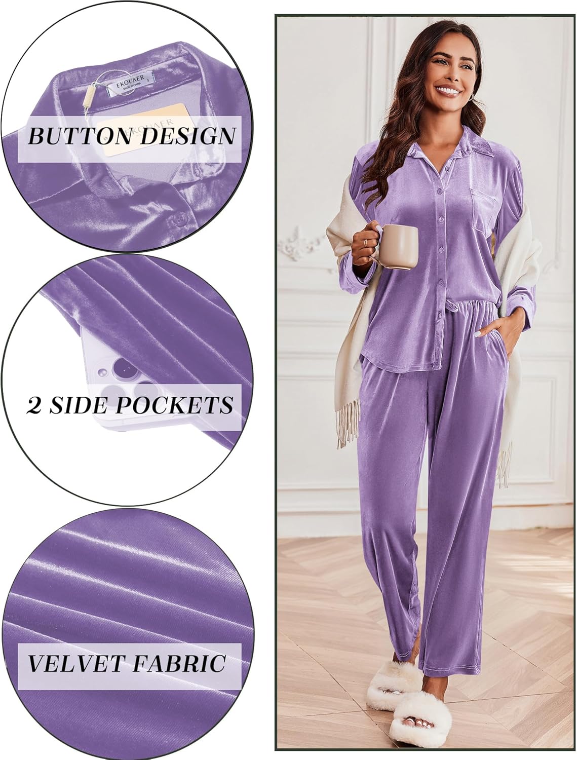 • Features:The women's pajama set includes a long-sleeved button-down top and matching wide-leg pant. The velor Lounge set features soft pajamas with button, elastic waist, handy side pockets, and wide leg pants for a perfect loose fit