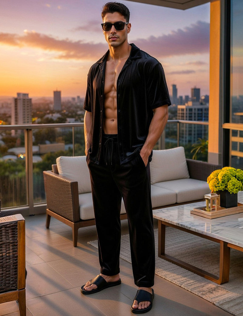 Surrender to decadence with this sumptuous two-piece set, where plush fabric catches the golden hour light and drapes the body in effortless, masculine luxury.