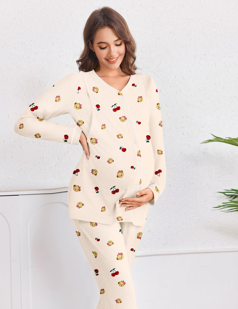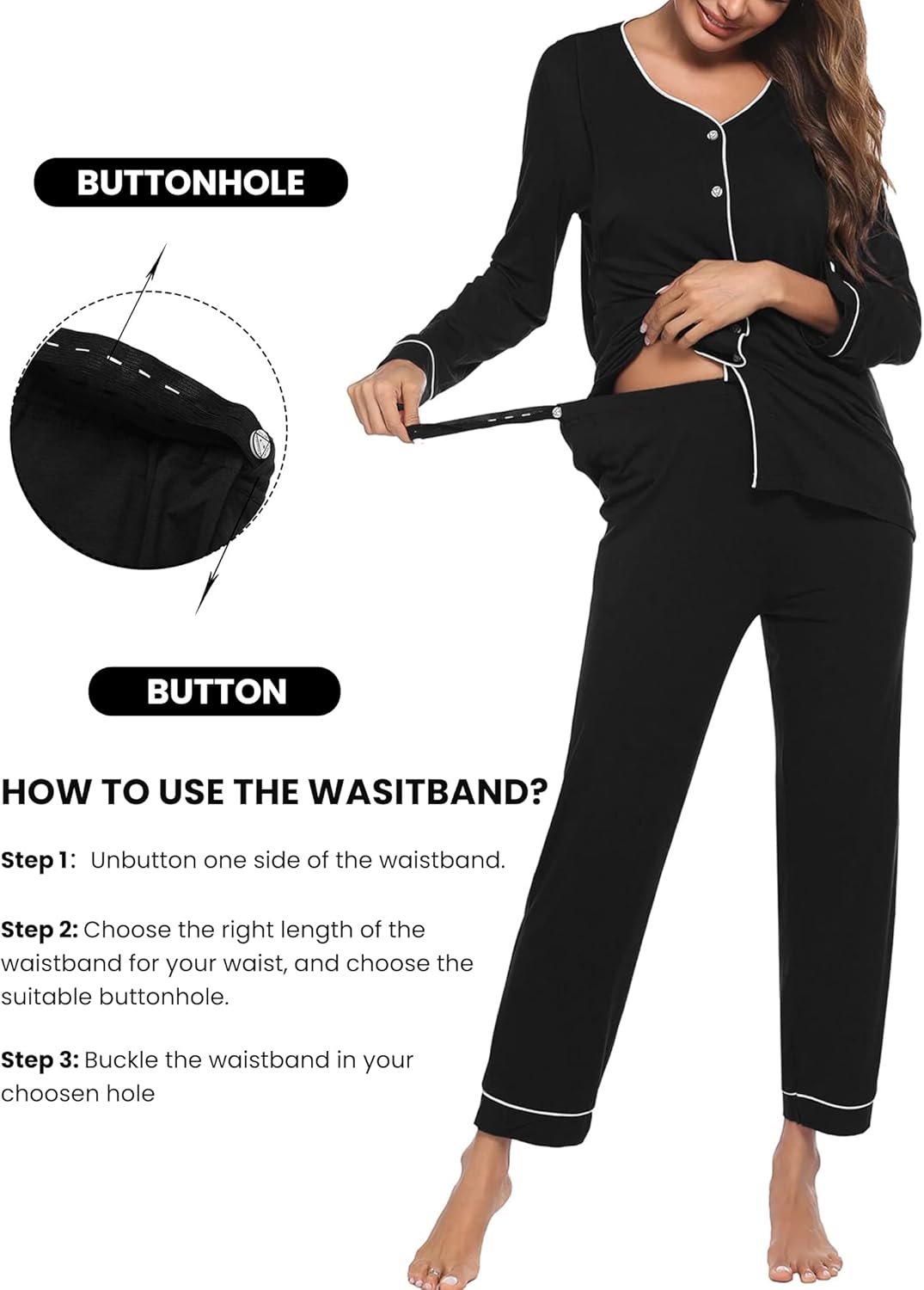 • ADJUSTABLE WAISTBAND: This 2-piece Maternity Breastfeeding Sleepwear set includes a soft and comfortable long sleeves top and long pregnancy pants. The elastic waistband is ADJUSTABLE, making it roomy, and you can let it out when the bump grows. Elastic waistband with elastic button extenders for easy transition from pregnancy to postpartum use. You can get the best fit size by adjusting the length of the elastic waistband.
