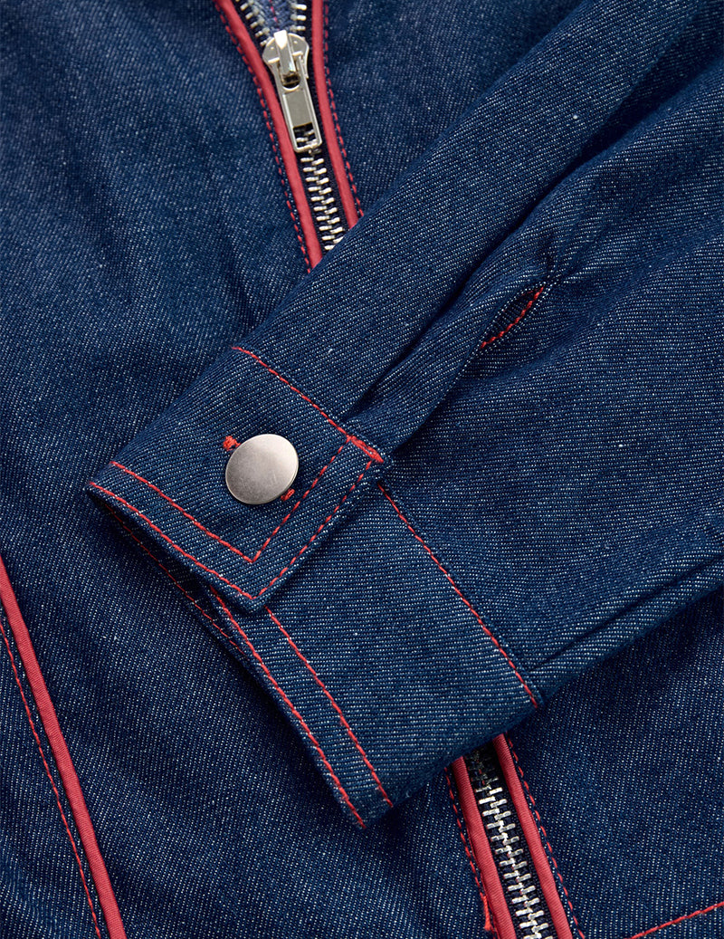 Retro Red Topstitched Denim Wide Leg Long Sleeve Jumpsuit
