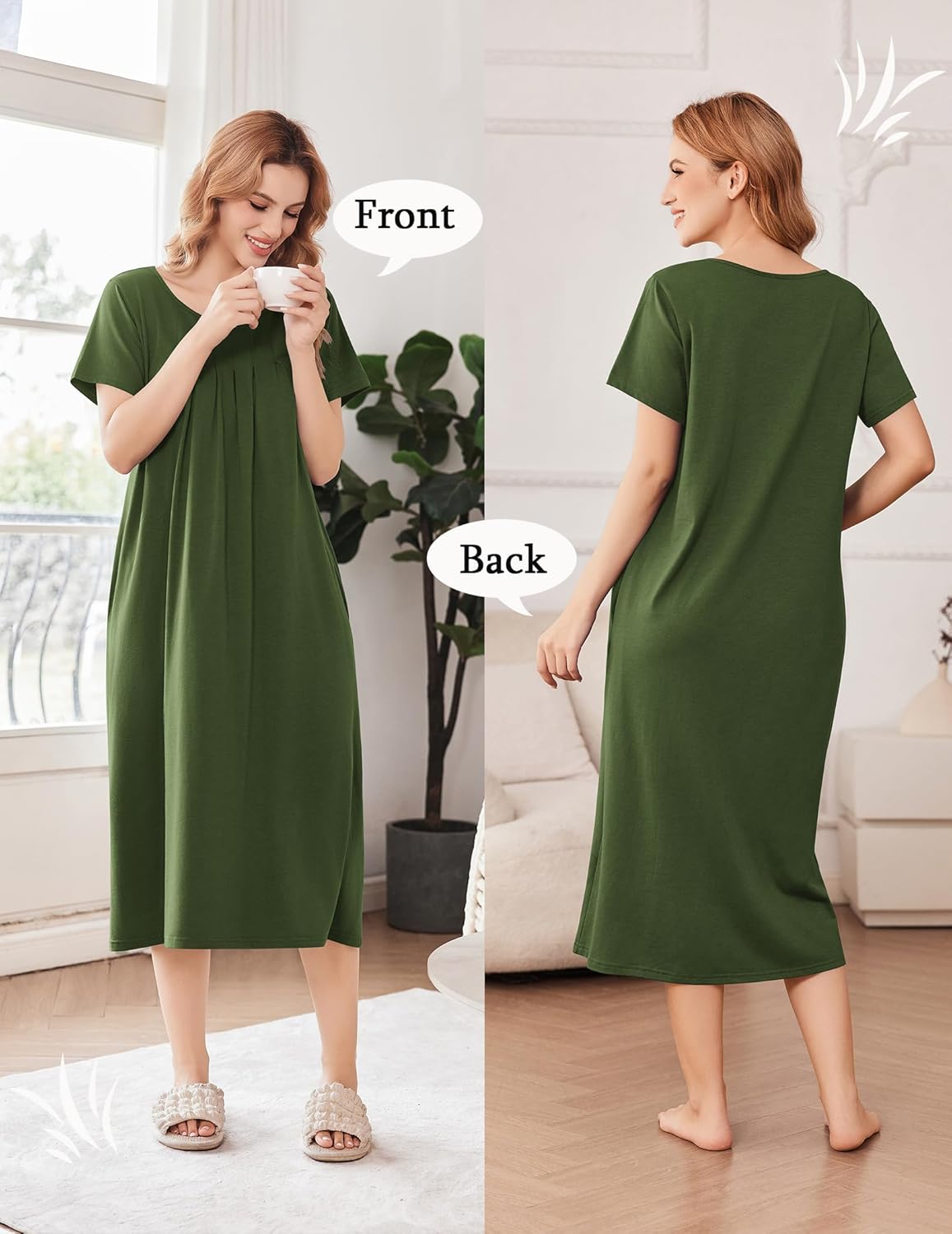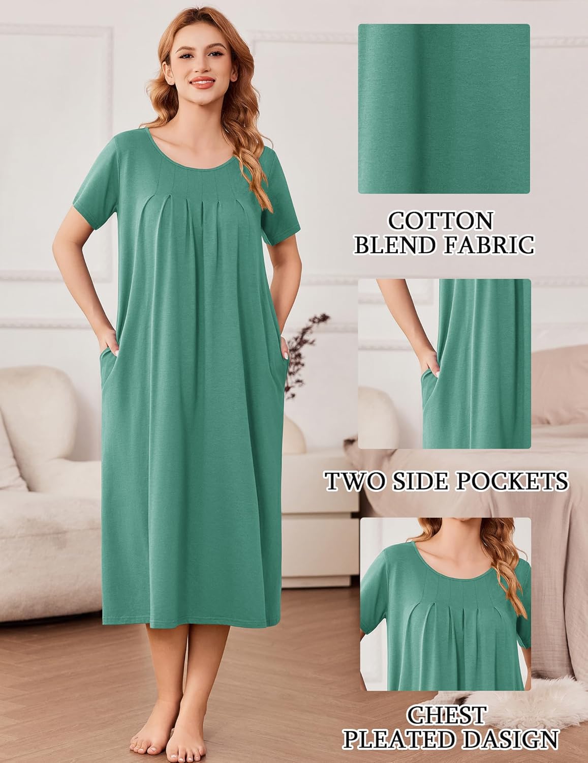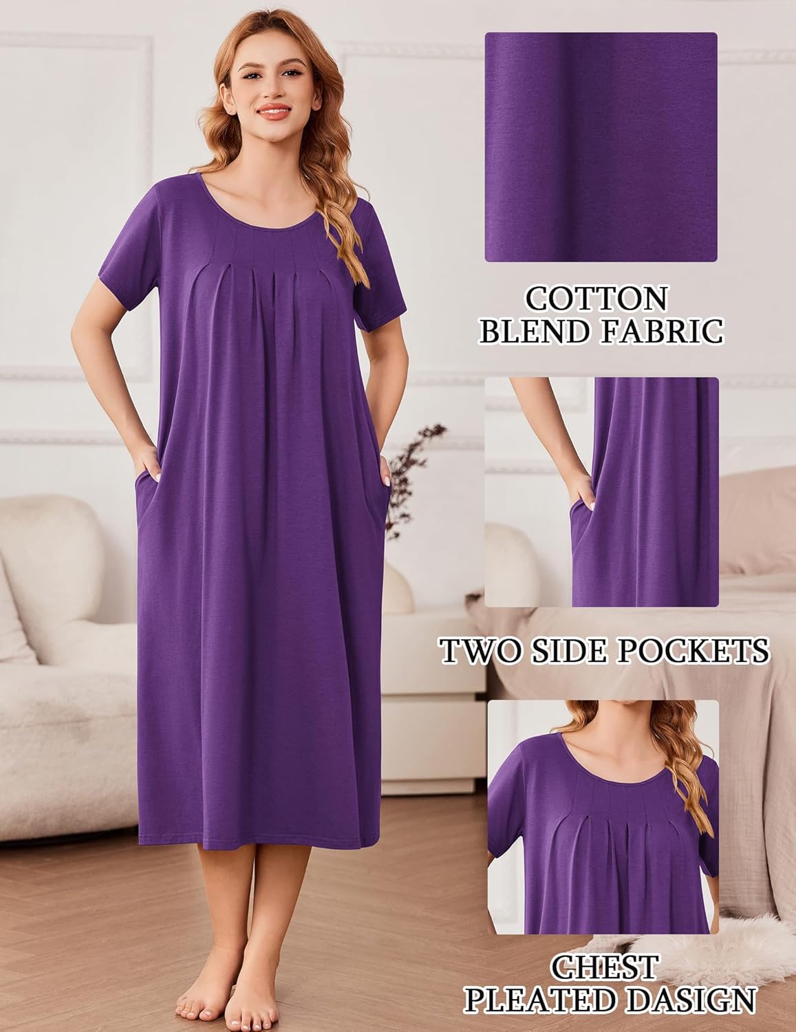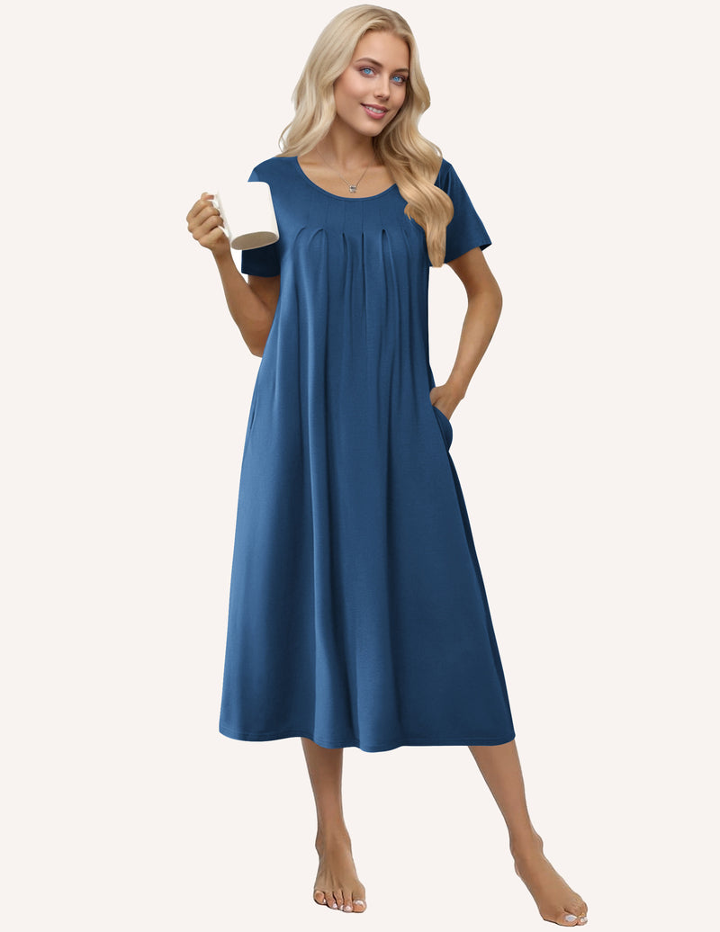 • Nightdress featuring front pleats detail, short sleeve sleepshirt,mid length nightshirt, house dress with pockets, which can be used to hold small items such as mobile phones, keys, glasses, etc.