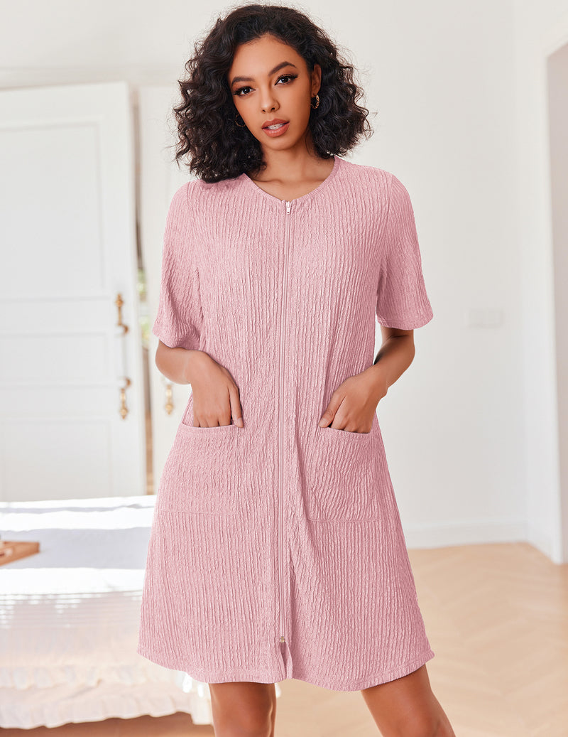 Zipper Front Bathrobe Short Sleeve House Long Nightgown