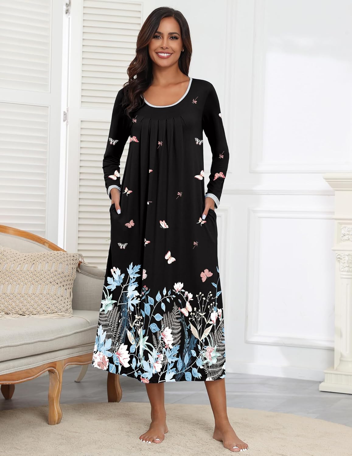 Long Sleeve Sleepshirts Casual Loose Sleep Dress with Pockets