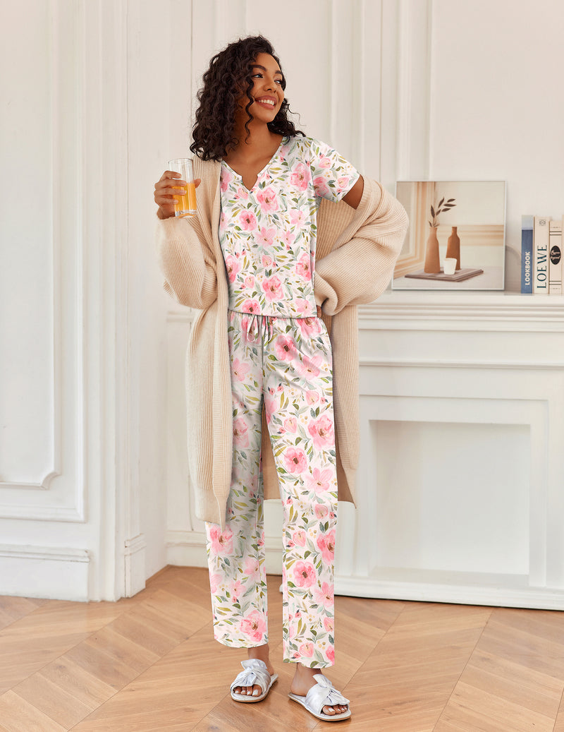 2 Piece Pajamas V Neck Short Sleeve Top and Long Pants