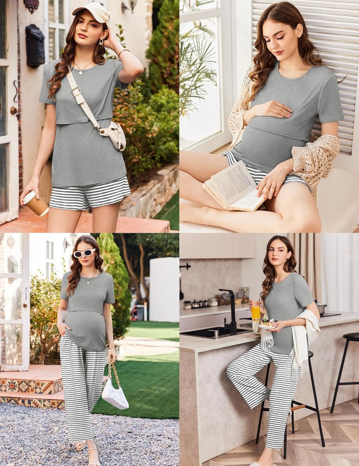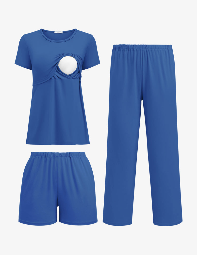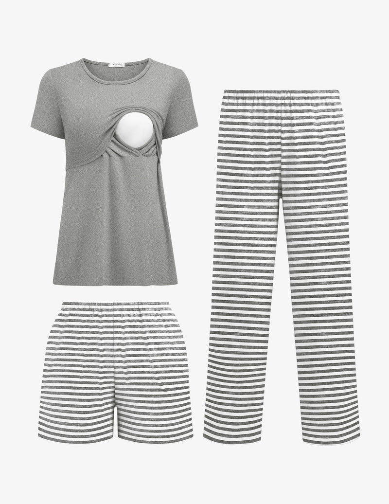 Postpartum pajamas set includes: 1 piece short sleeve nuring top, 1 piece maternity shorts and 1 piece pregnancy long pants. From pregnancy to breastfeeding, you can get it all in one set, eliminating the worry of repeated purchases.