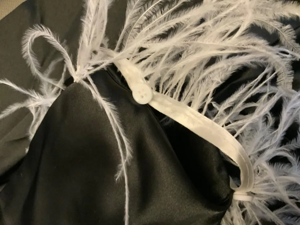 Very soft and smooth satin. The style is fun, modest yet sexy. The feather band around the wrists are removable when it comes time for washing and are attached by a button/elastic loop. This material does not stretch (waistband does) so pay attention to the size and make sure you order accordingly. This would be great for vacation, lounging at home, pajama party and gifting!