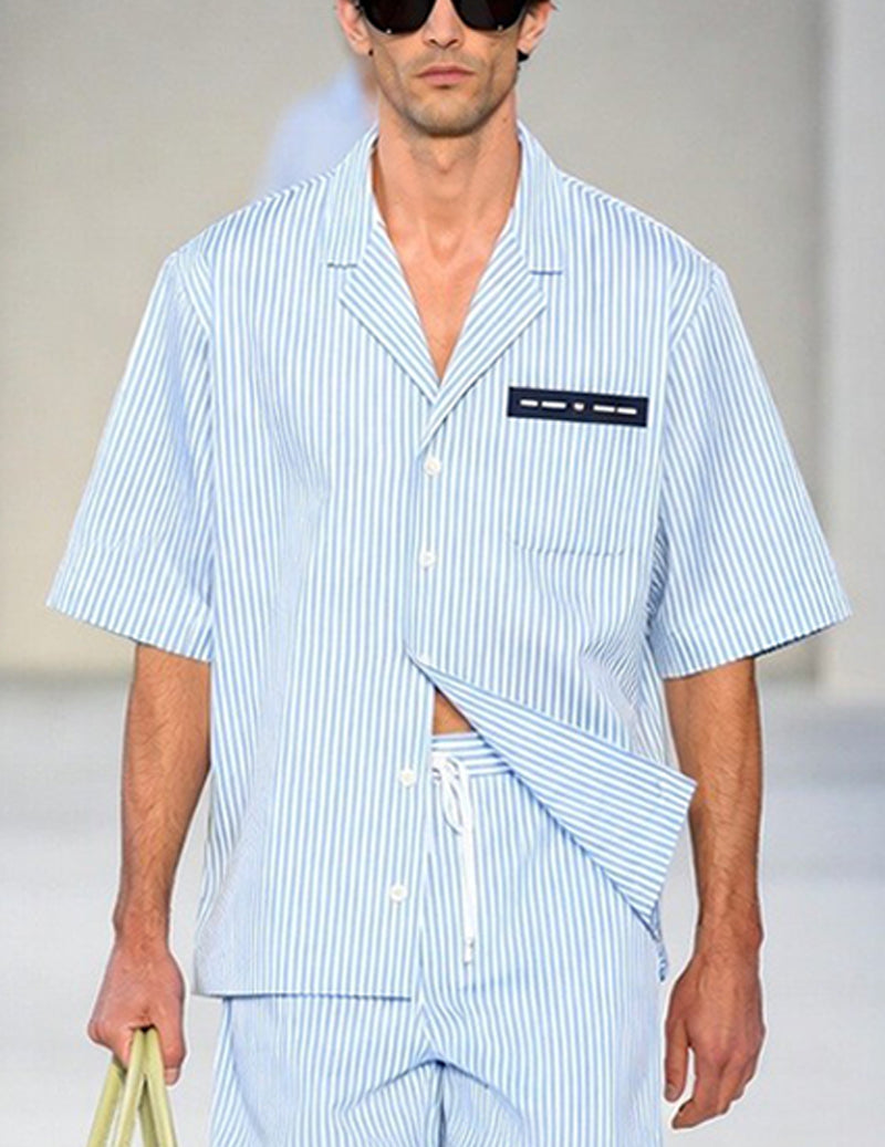 • Short-sleeve camp-collar shirt in soft light blue with delicate white pinstripes — wide notched collar framed by crisp navy piping along the edges, placket, cuffs, and chest patch pocket for clean, architectural definition
