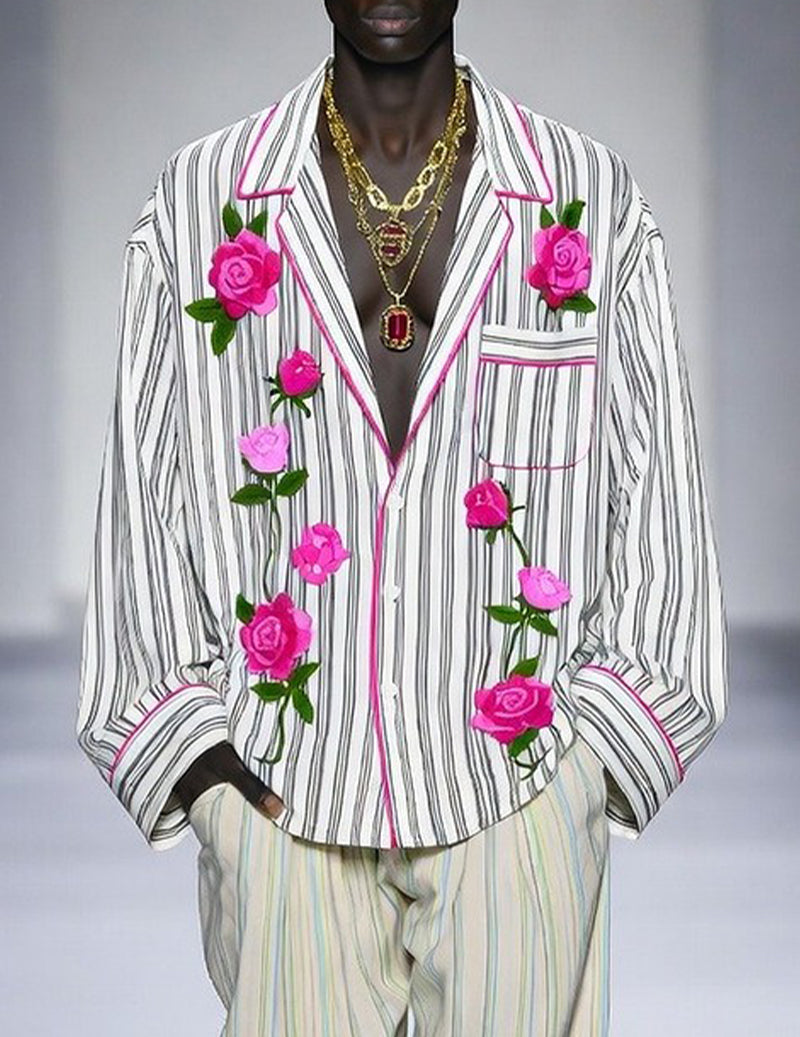 - The dramatic rose details, crisp pinstripes, and generous proportions create a look that feels uniquely expressive, impeccably crafted, and quietly confident