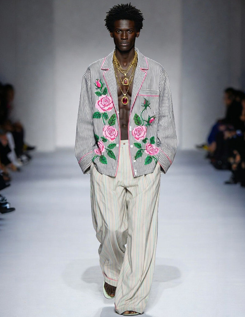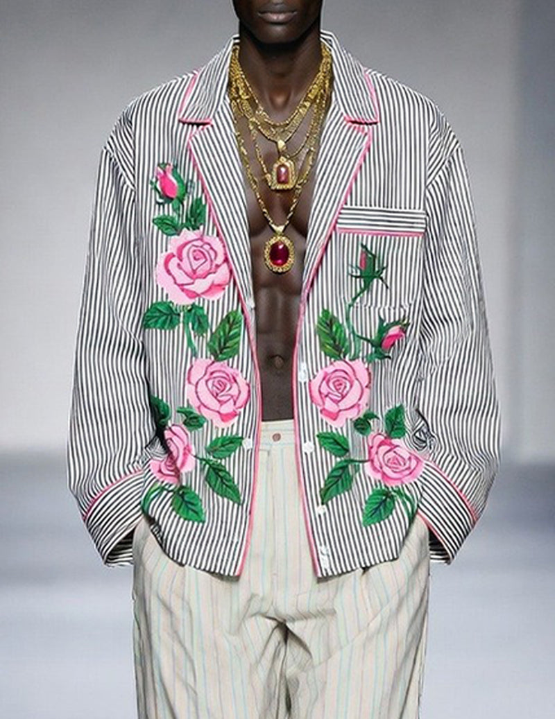 - Black-and-white pinstripe shirt with oversized rose motif