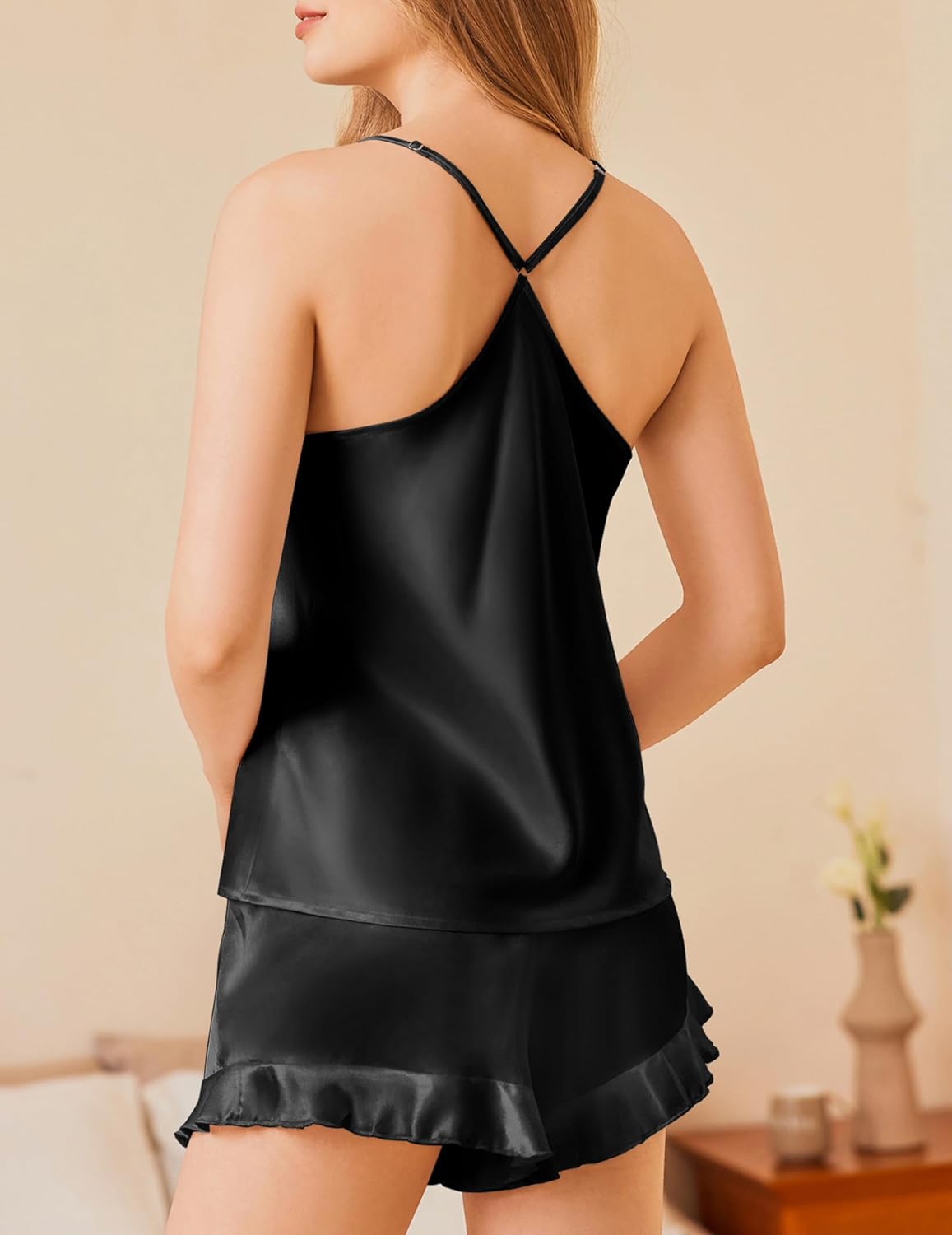 FEATURES: Cute satin pj set for women features a v-neck top,special design shorts of lovely ruffled with comfortable elastic, and there are a variety of printed styles for you to choose from.
