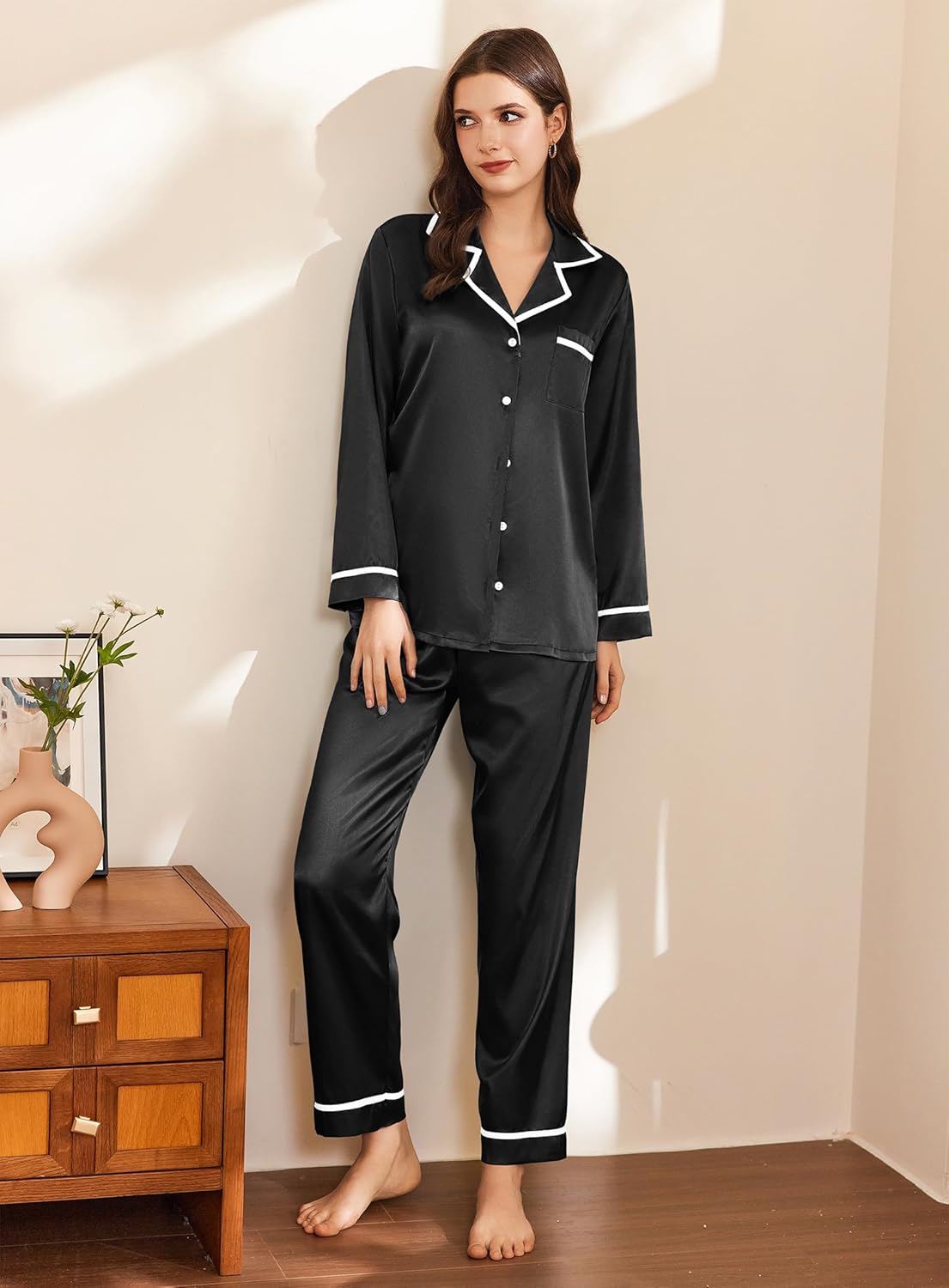 [FEATURES] Our silk sleepwear features a relaxed fit, offering ample freedom of movement. The cozy lounge set boasts a classic button-up design, notch collar, chest pocket, and elegant contrast-colored braided trim, blending sophistication with a touch of avant-garde style. The elastic waist pants are not too tight and easy to put on, ensuring a lazy and comfortable sleep