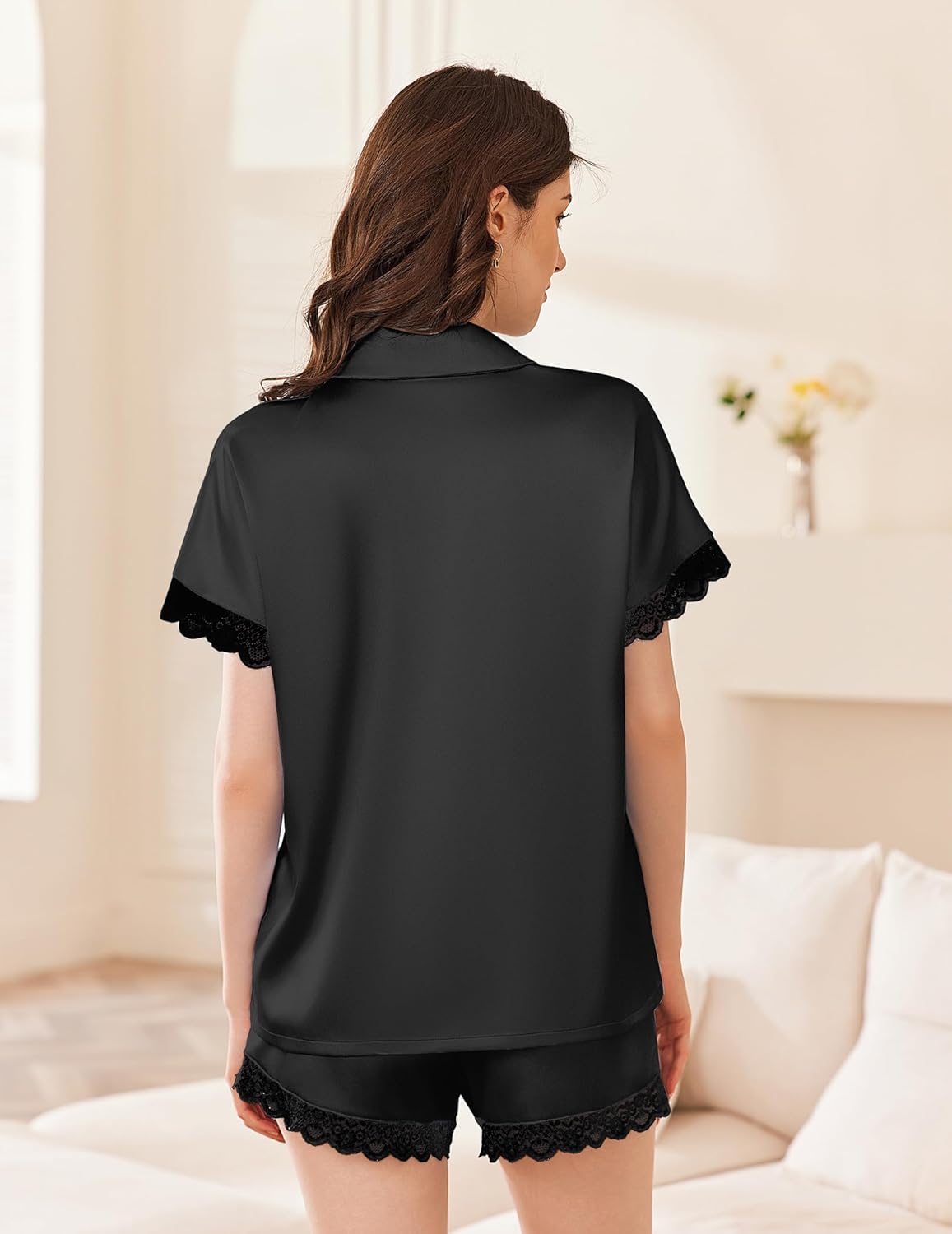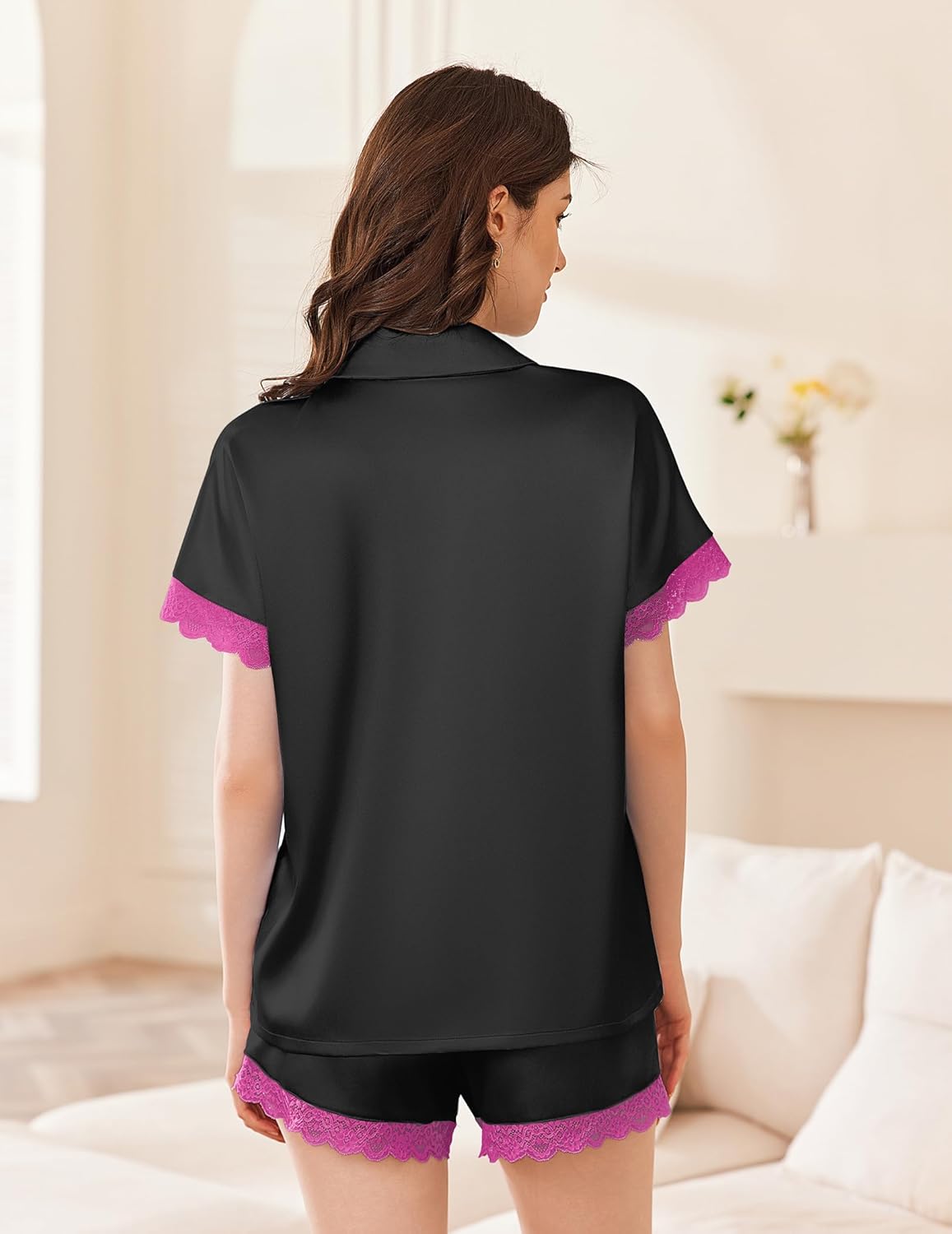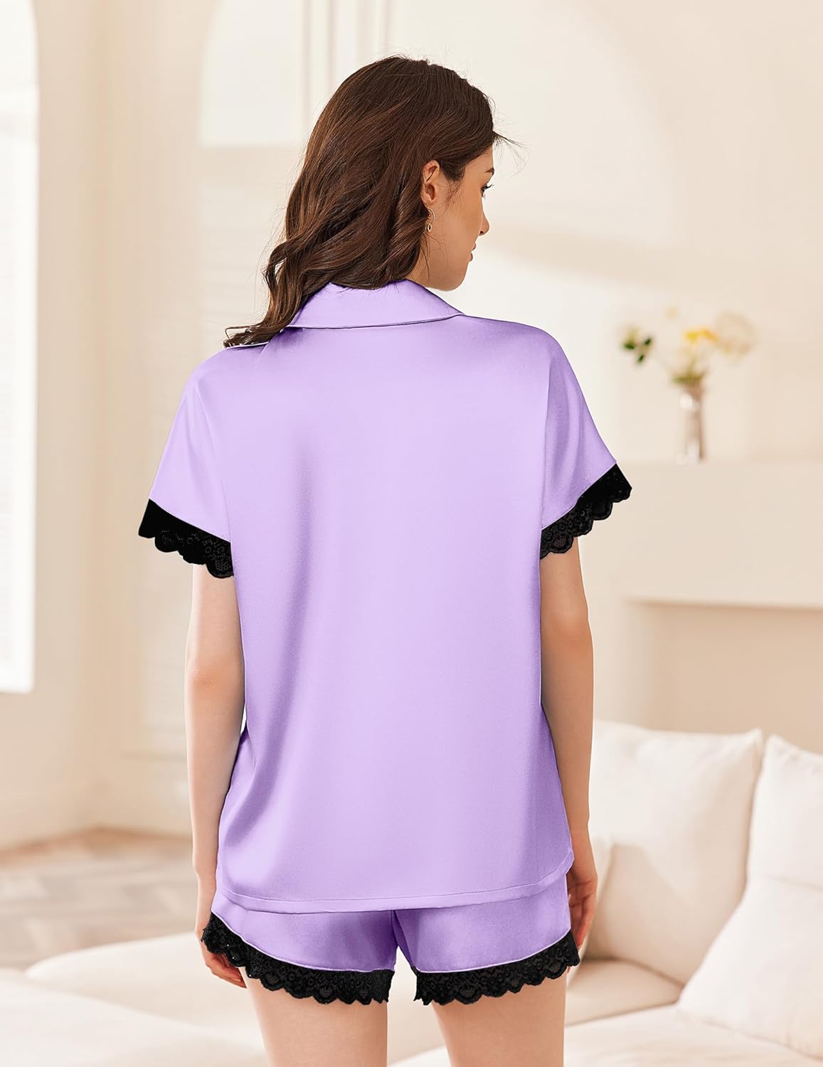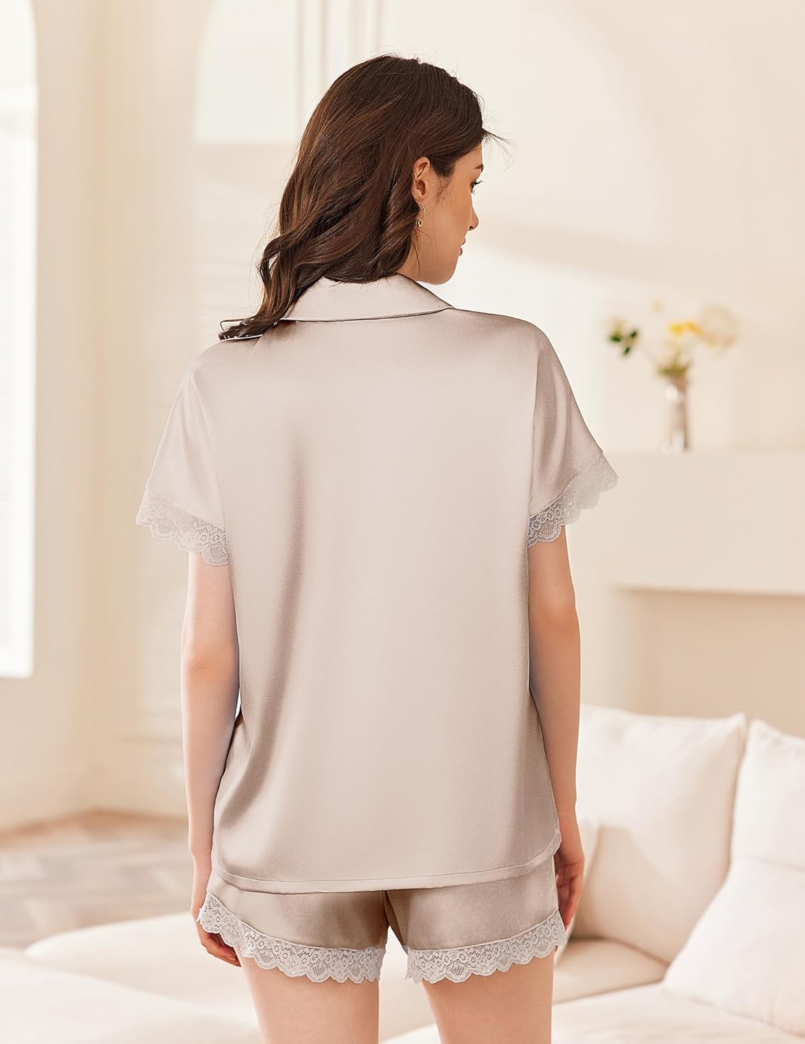 Button Up Top: The short sleeve satin pajamas sleepshirt features turn-down collar, drop shoulder sleeve, lace trim design, comfy for casual wear. Full button design makes the silk pjs also super convenient for breastfeeding , postpartum, nuring