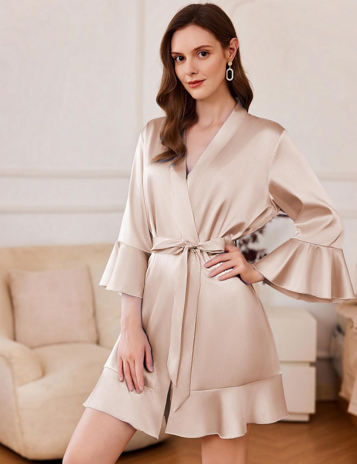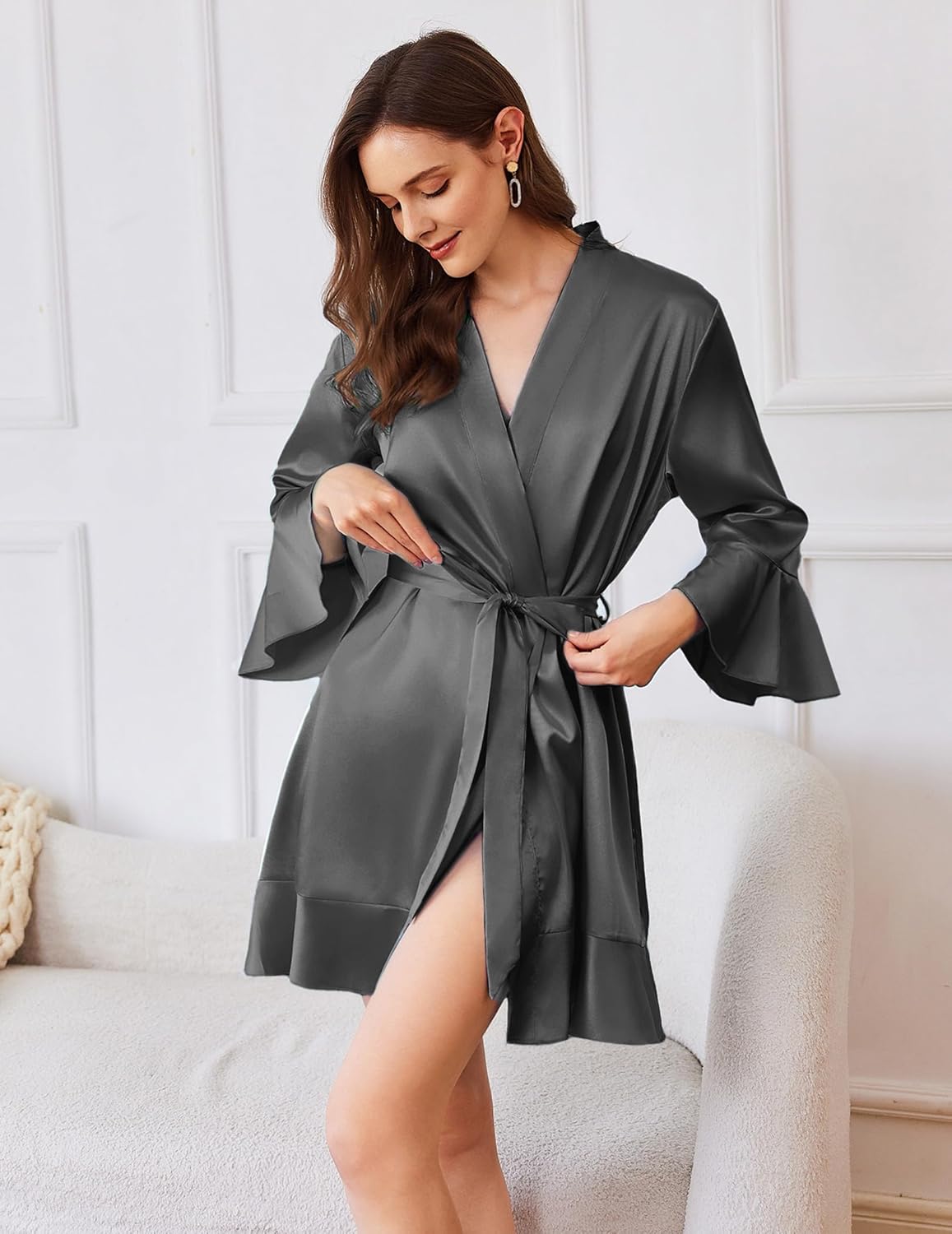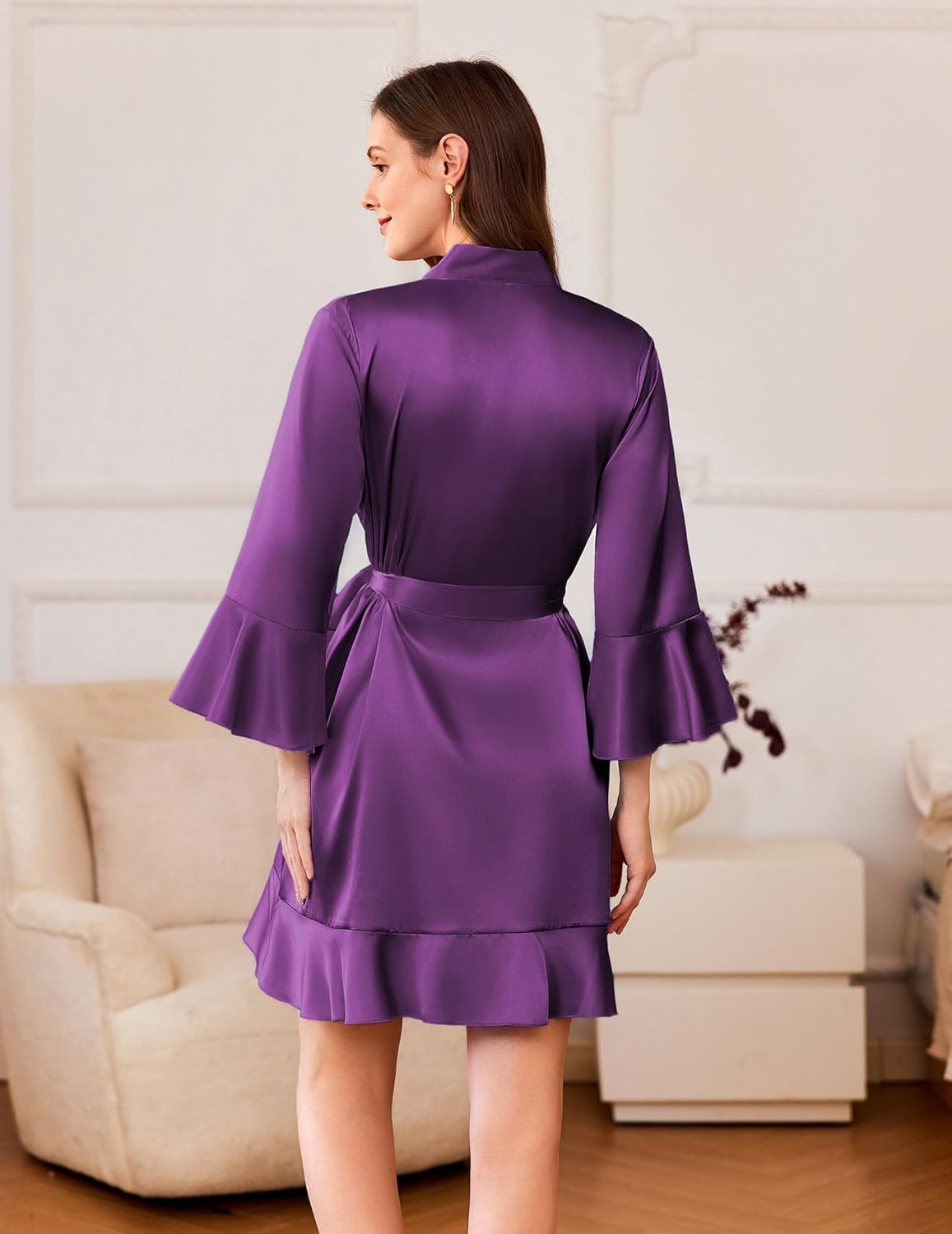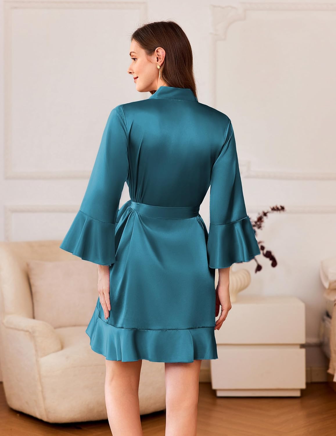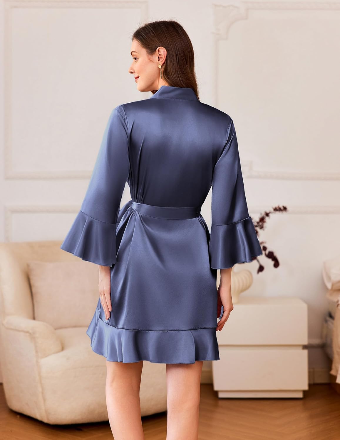 Satin Robe Short Ruffle Hem Silky Kimono Brides Bathrobes