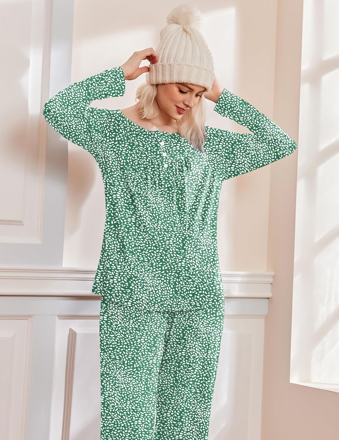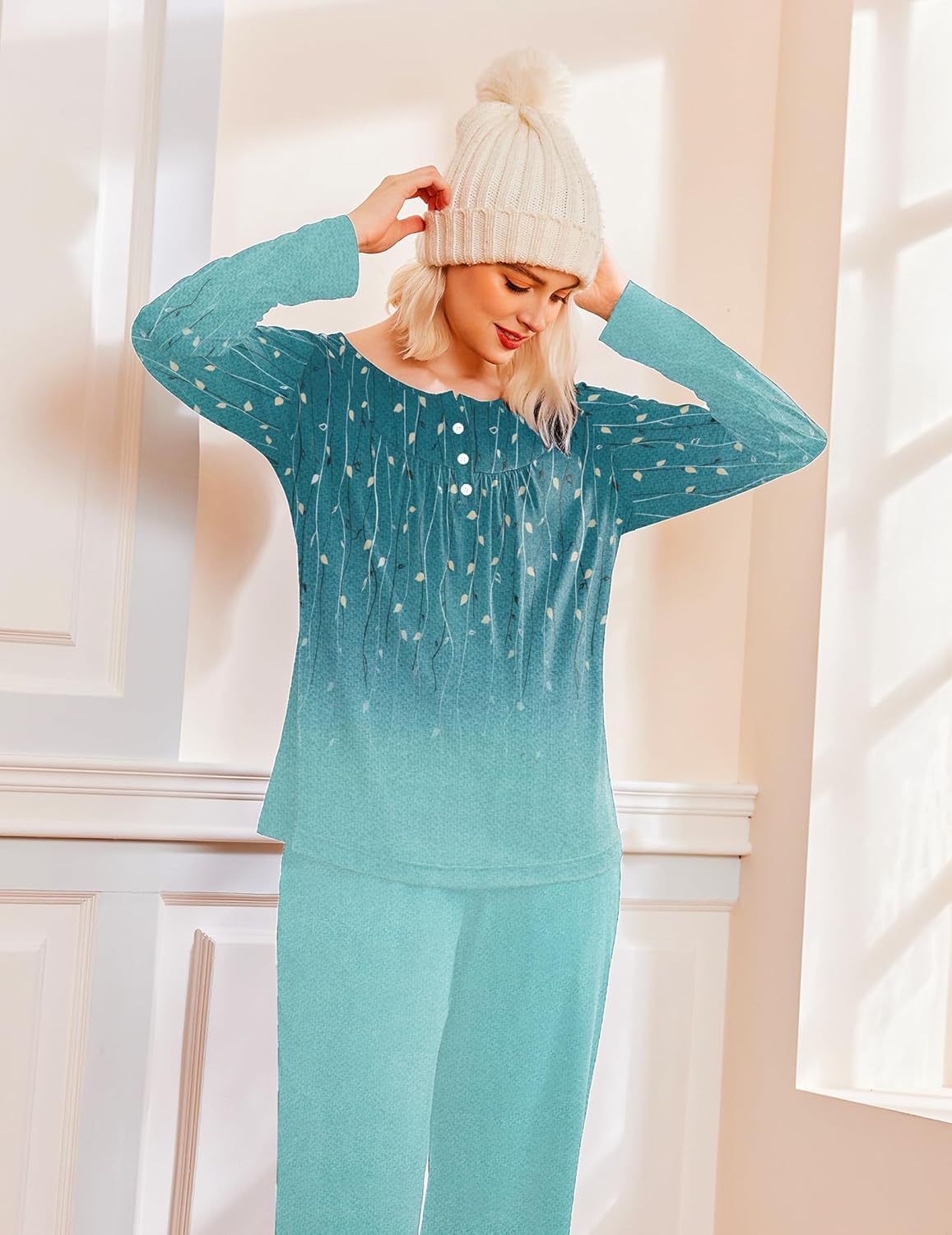 • Casual 2 piece pajamas, long sleeve pjs tops, soft nightwear, henley neck and front pleated detailed design