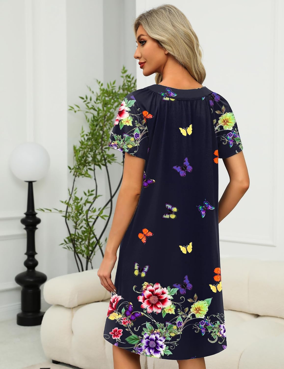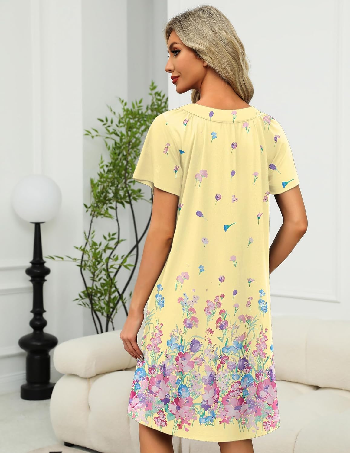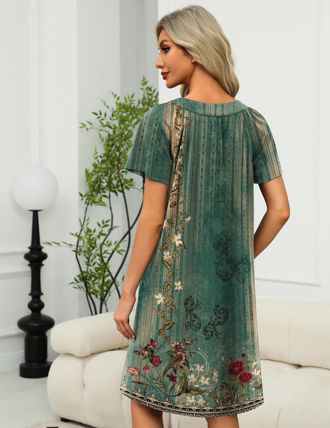 The house coat provides ultimate comfort without looking or feeling sloppy. The V-neck and floral print design subtly showcase your charm. The pleated design adds a touch of elegance, and the knee length makes it perfect for wearing around the house