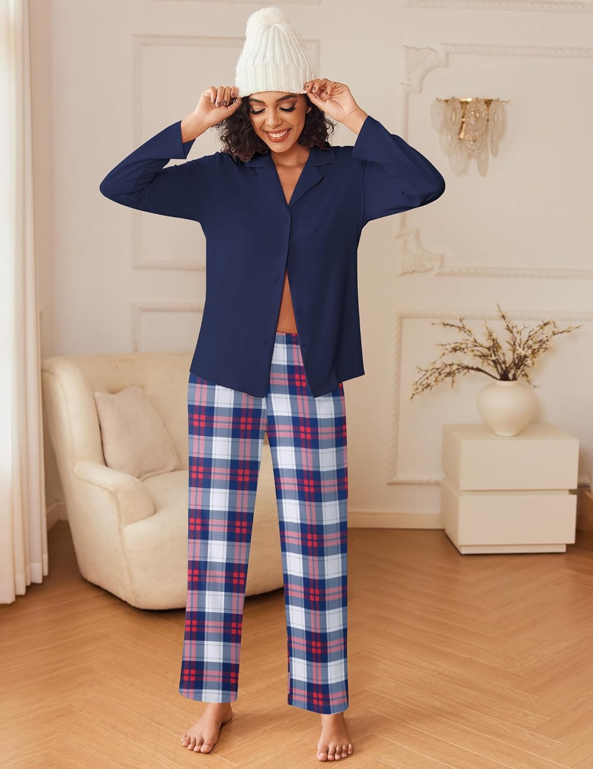 Long-sleeved Top: The top of the women's sleepwear is designed with long sleeve and lapel button. What makes this set of pjs eye-catching is the contrasting colors. The top is solid color while the pants are printed.