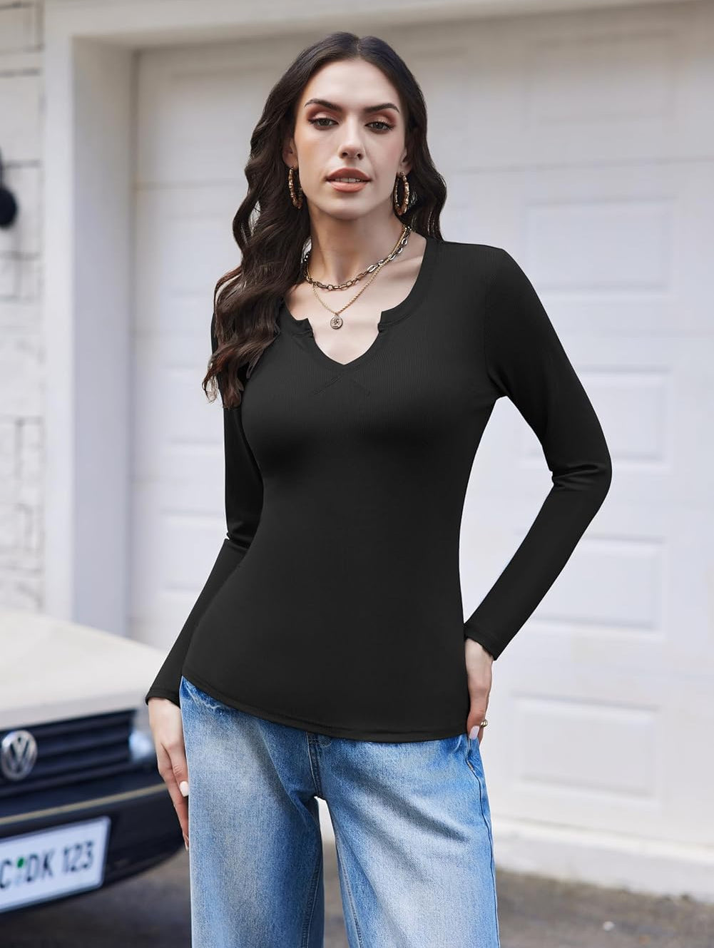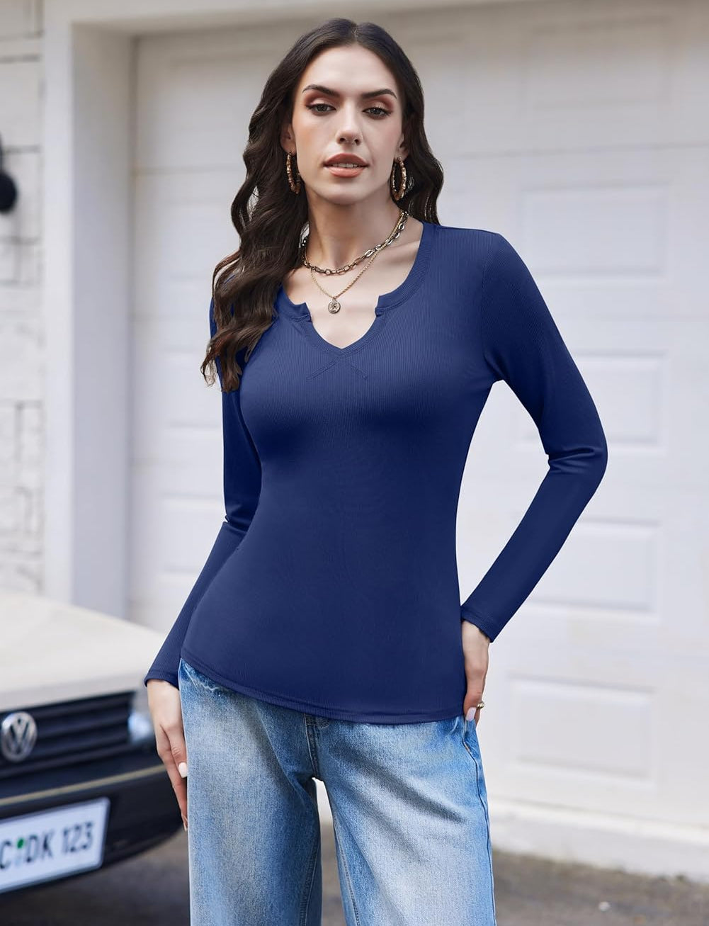• Design: The Notched v-neck design of the womens long sleeve tops makes your neck look sexier, long sleeves, ribbed knit, elastic enough, can better slim your body shape and show your perfect body. Multiple colors of this basic tees for women can provide you with more matching options to show different fashion styles