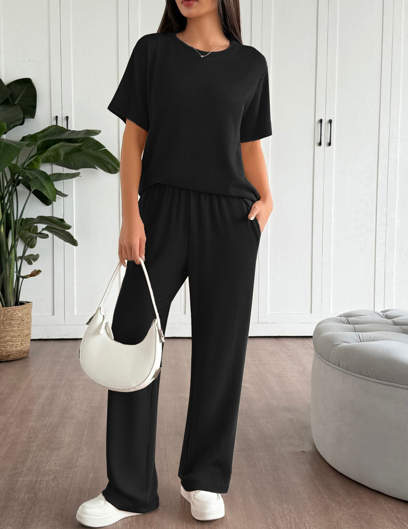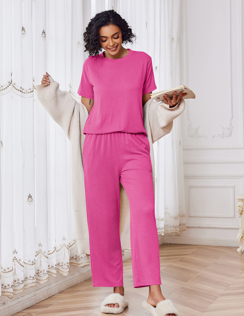 Ekouaer Lounge Sets for Women 2 Piece Matching Travel Outfits 2026 Loose Short Sleeve Top Wide Leg Pants Pockets