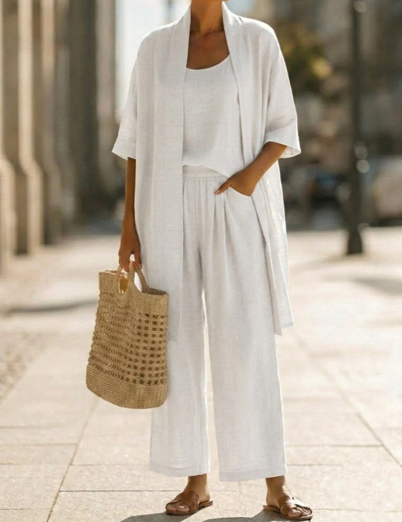 This chic three-piece linen ensemble pairs a lightweight open-front kimono cardigan, a soft matching cami tank top, and flowing wide-leg pants. Crafted from premium breathable linen, it drapes beautifully and delivers cool, graceful comfort for warm days and relaxed occasions.