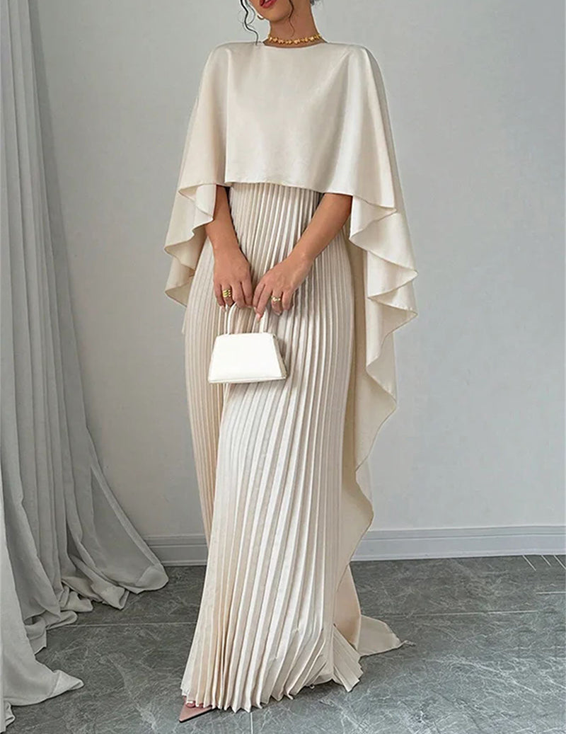 Batwing Sleeve Pleated Maxi Dress Elegant Cape Overlay Asymmetrical Hem Formal Gown