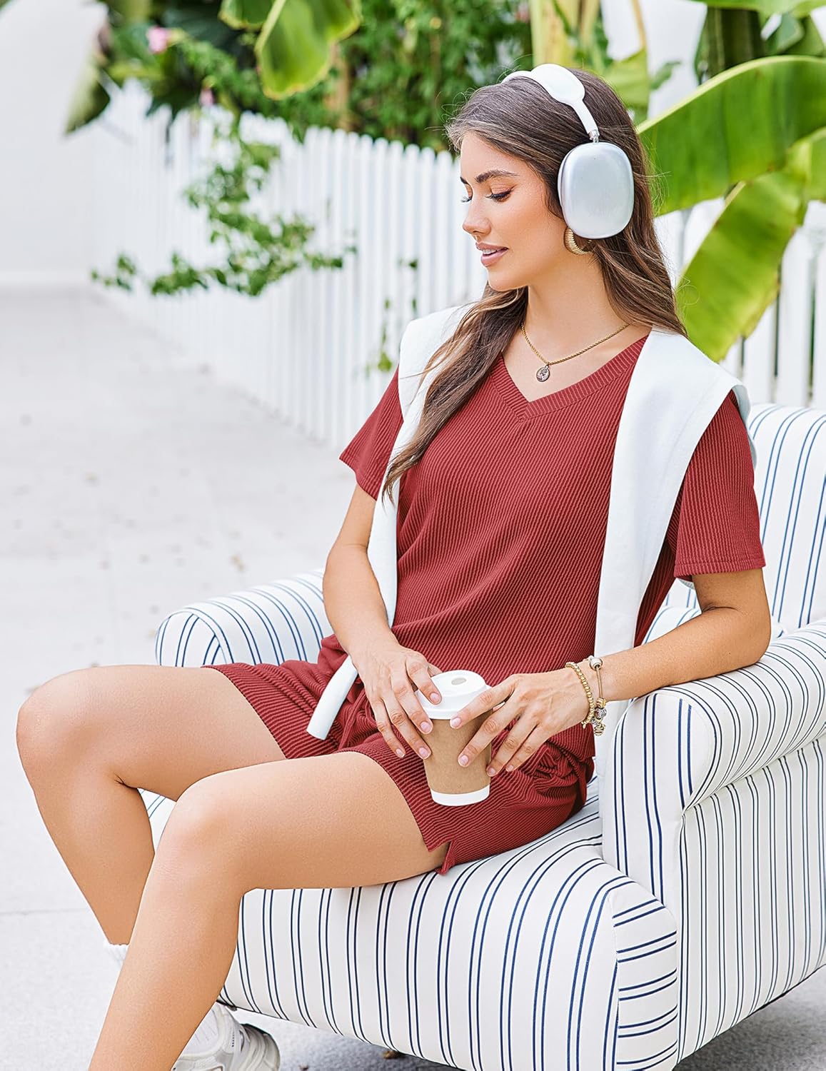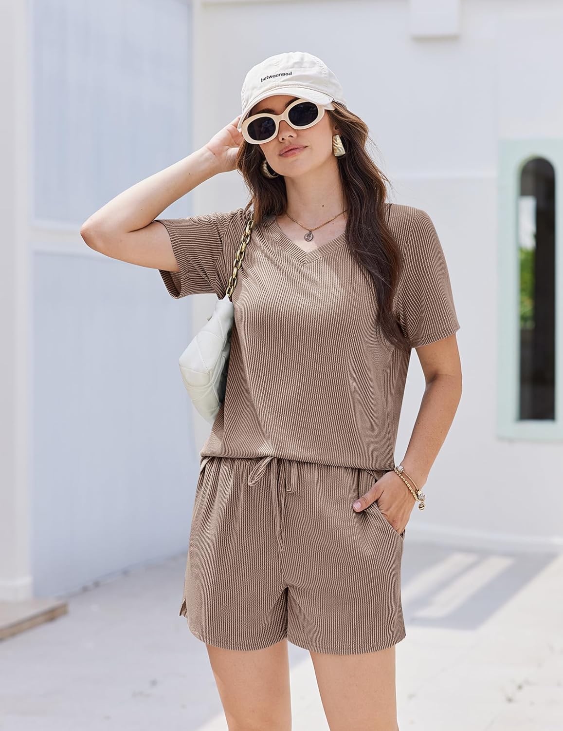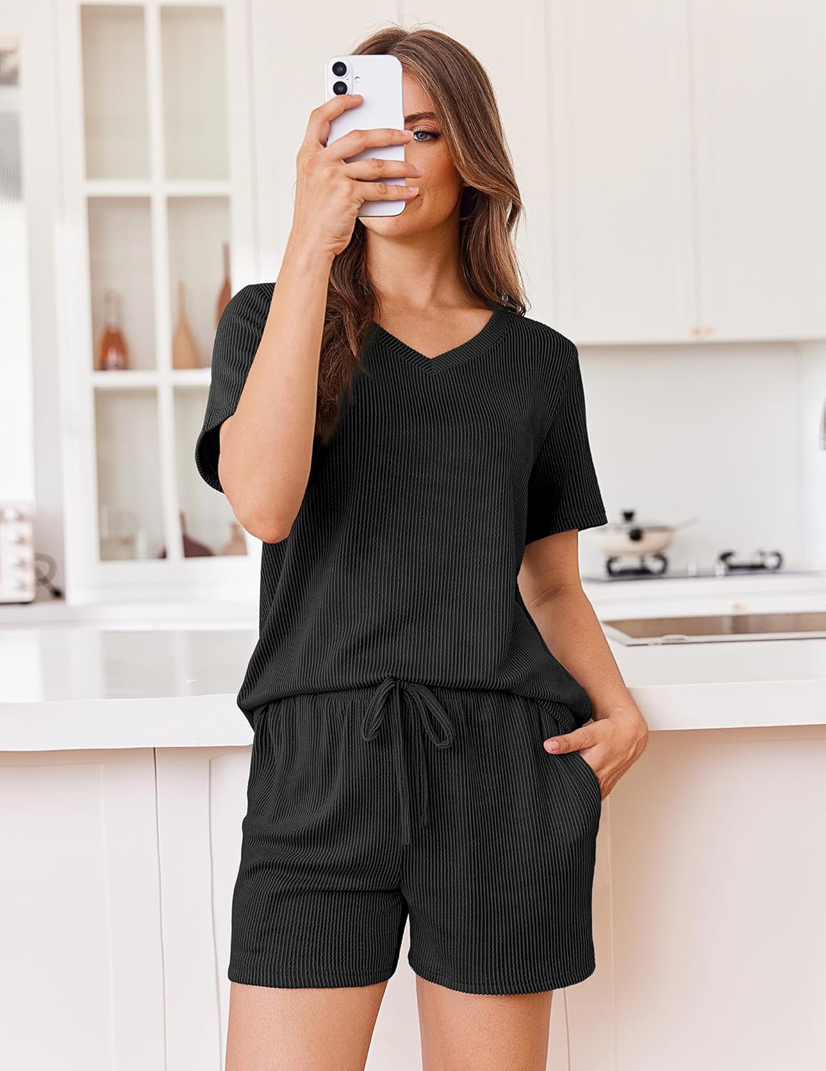 Short Sleeve Tops: Elegant Lounge Sets feature a flattering V-neck design with a relaxed, loose-fitting silhouette that celebrates every body type.