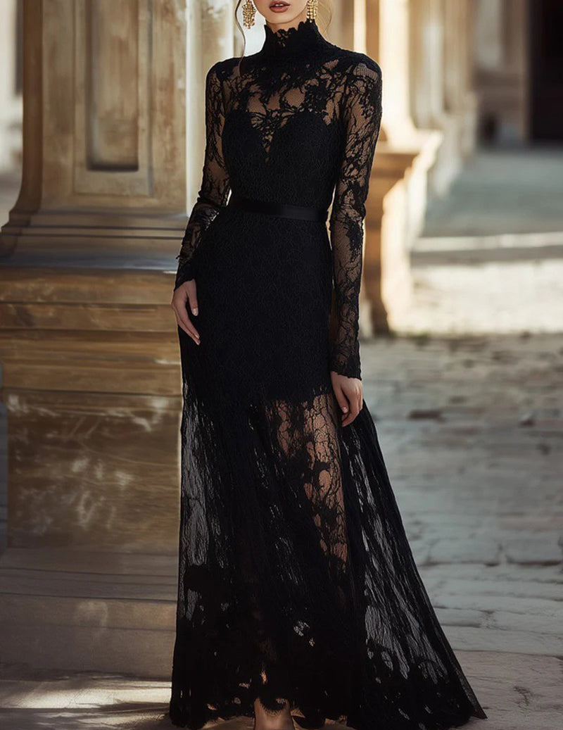 Timeless allure in exquisite black lace. This elegant maxi dress features a dramatic high mock neck with delicate beading, sheer long lace sleeves, and a fitted bodice that flows into a graceful floor-length sheer lace skirt. The intricate floral lace creates beautiful texture and movement, offering sophisticated glamour for unforgettable evenings.
