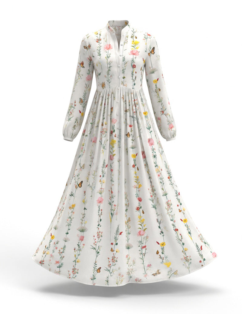 Effortlessly romantic and blooming with delicate beauty. This enchanting white maxi dress features a whimsical wildflower and butterfly print that brings a dreamy, garden-inspired charm. The mandarin collar, full button front, and softly pleated skirt create graceful movement and feminine elegance.
