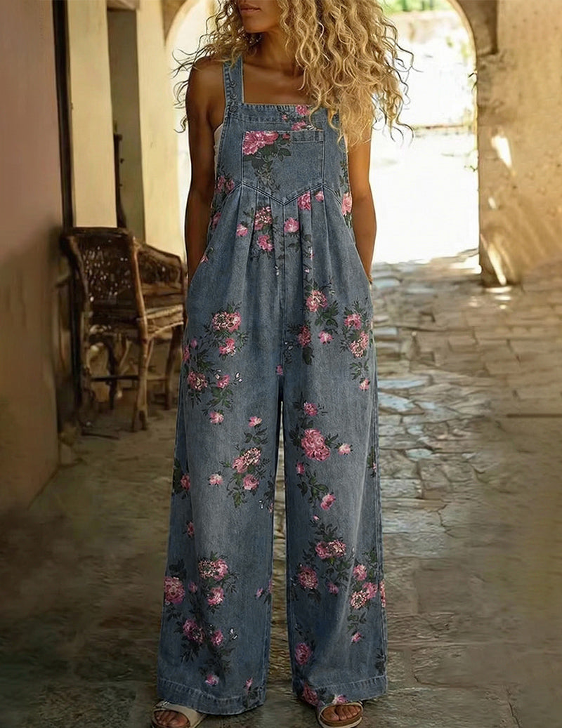 Floral Denim Overalls Wide Leg Printed Bib Jumpsuit Casual Boho Outfit