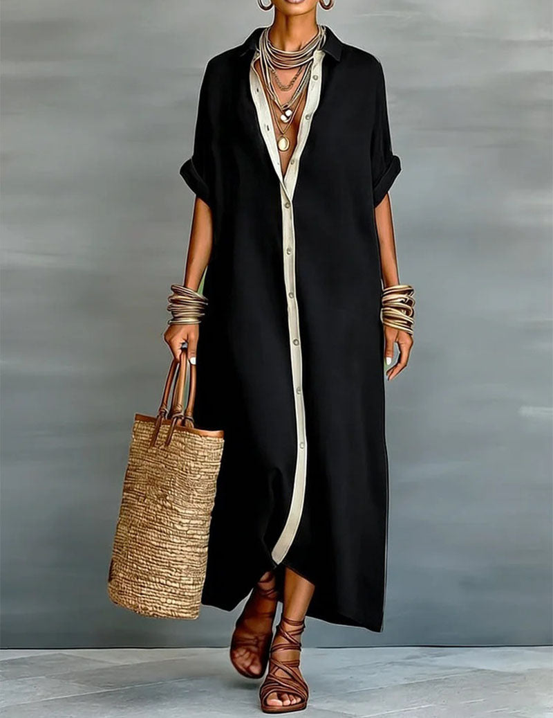 Effortless elegance meets everyday ease. This oversized long shirt dress features a classic collar, full button-front closure with a striking contrast placket, and short sleeves that roll up for a relaxed vibe. Crafted from soft, lightweight fabric that drapes beautifully, it offers a flowy midi silhouette with subtle asymmetrical hem movement—perfect for warm-weather comfort and style.
