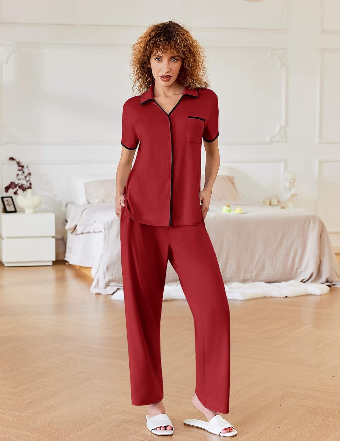 COMFORTABLE SLEEP SET: The pajamas is made of 95%Polyester 5% Spandex. Soft and breathable pajama set includes short sleeve top and full-length pants for year round comfort.