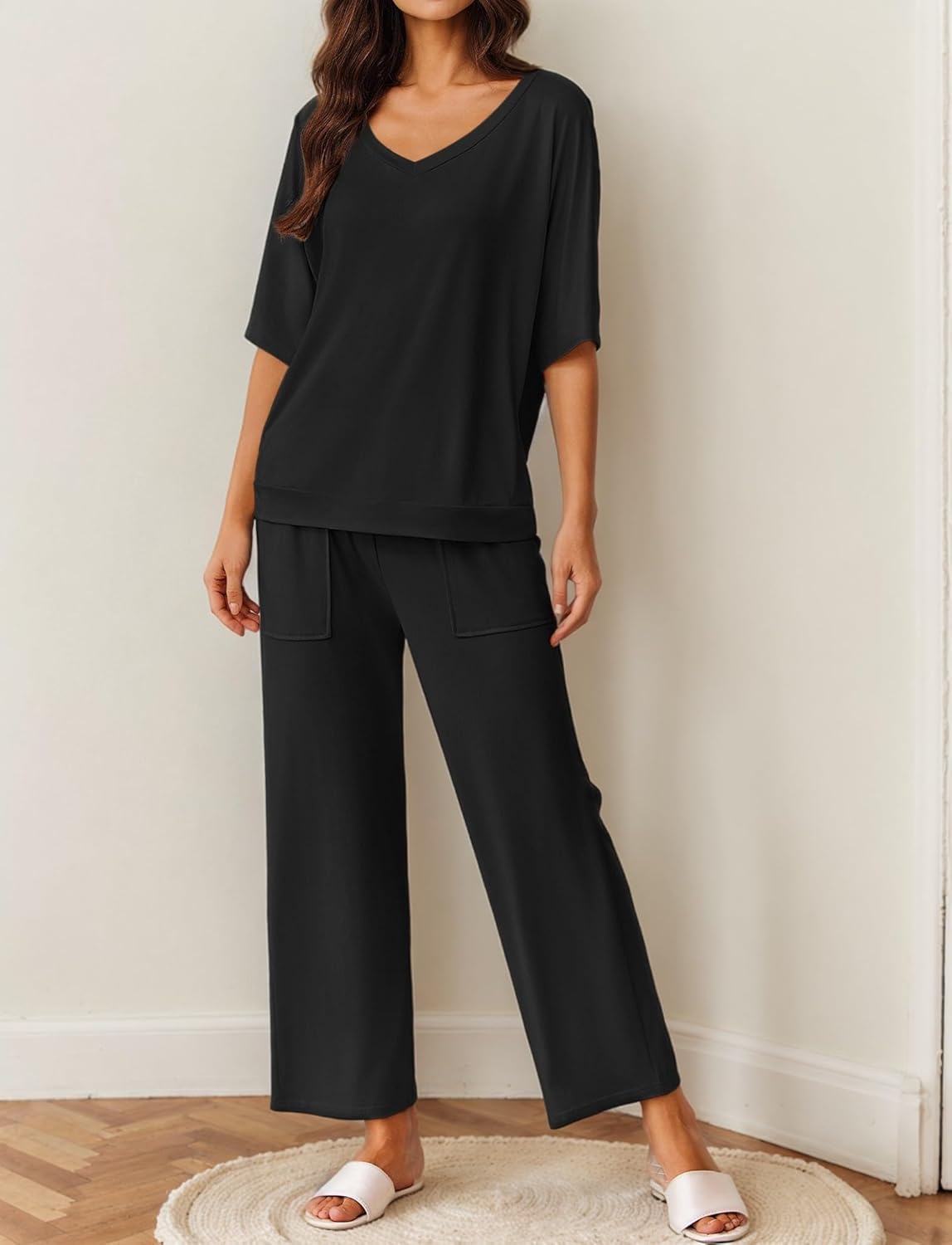 Bottom: The ankle-length pants in this lounge set feature a wide-leg cut with an elastic waistband. Large Front patch pockets are reinforced to prevent sagging while holding essentials like smartphones, ideal for casual wear or home relaxation.