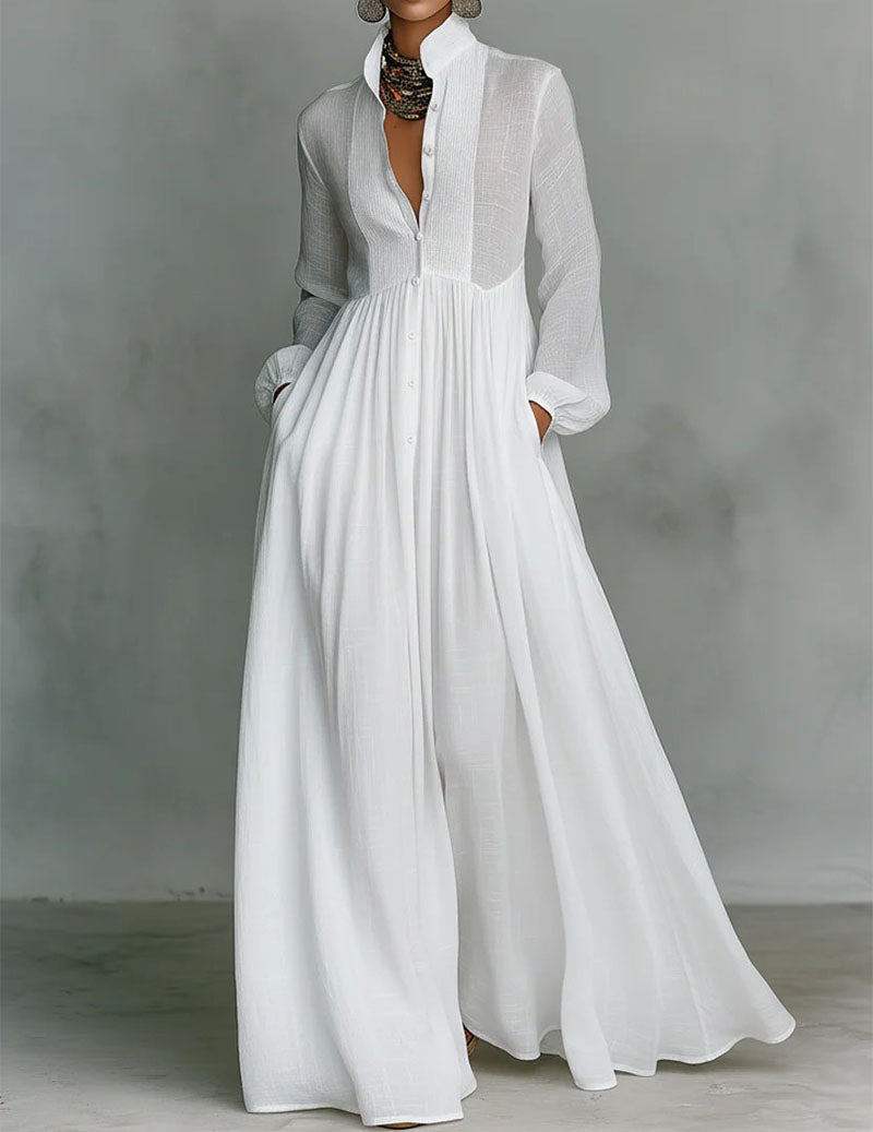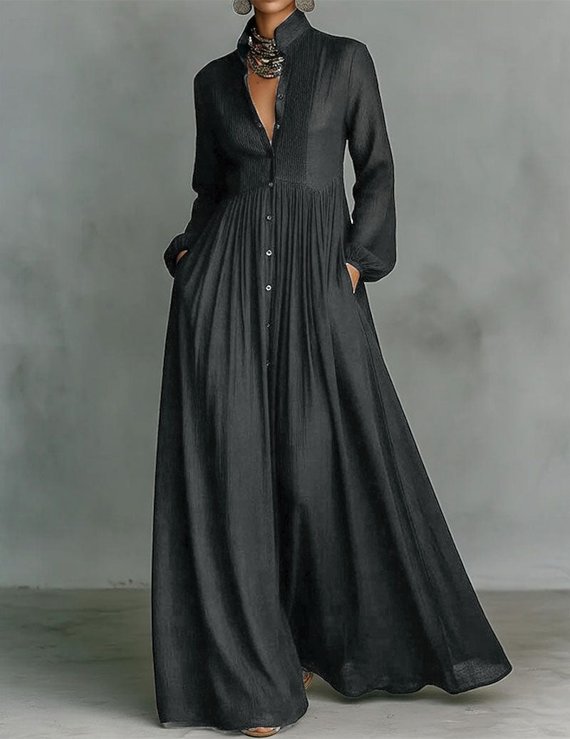- Effortless elegance in soft, flowing layers. This airy maxi shirt dress features a crisp high collar, delicate pleating through the bodice, and long sleeves with gentle cuffs. The relaxed button-front design and side pockets create a polished yet comfortable silhouette that moves beautifully with every step.