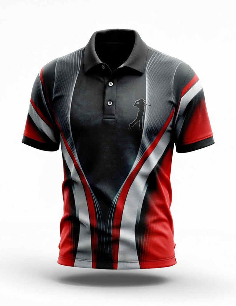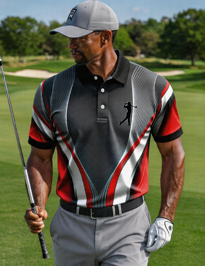 Command attention with bold athletic style and modern performance. This striking black golf polo shirt features dynamic geometric patterns in vibrant red, white, and gray, along with a powerful golfer silhouette that celebrates your game. The slim fit and premium breathable fabric deliver a sharp, confident look that stands out on the course.
