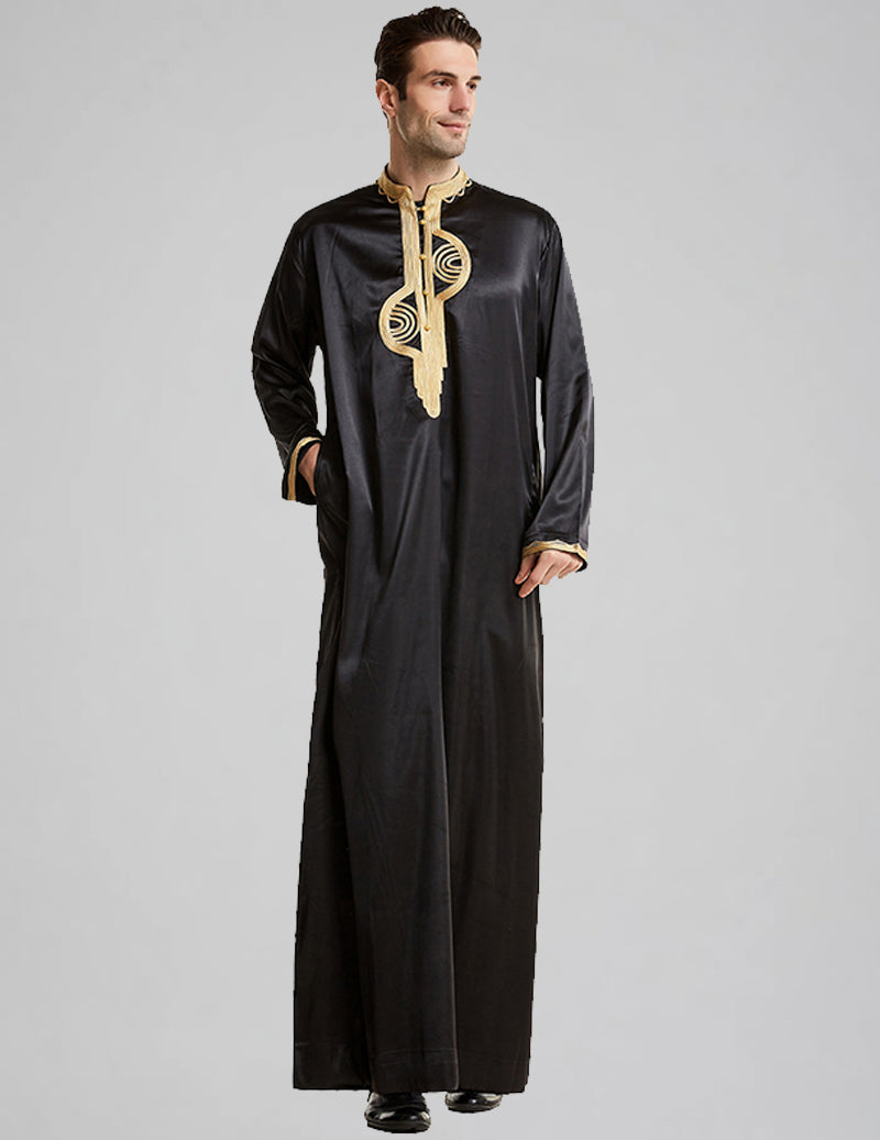 Timeless sophistication with exquisite craftsmanship. This premium men's thobe features intricate gold embroidery on the neckline, placket, and cuffs, paired with a classic round neck and flowing full-length silhouette. Crafted from soft, lightweight, breathable fabric, it drapes elegantly for all-day comfort and refined style.