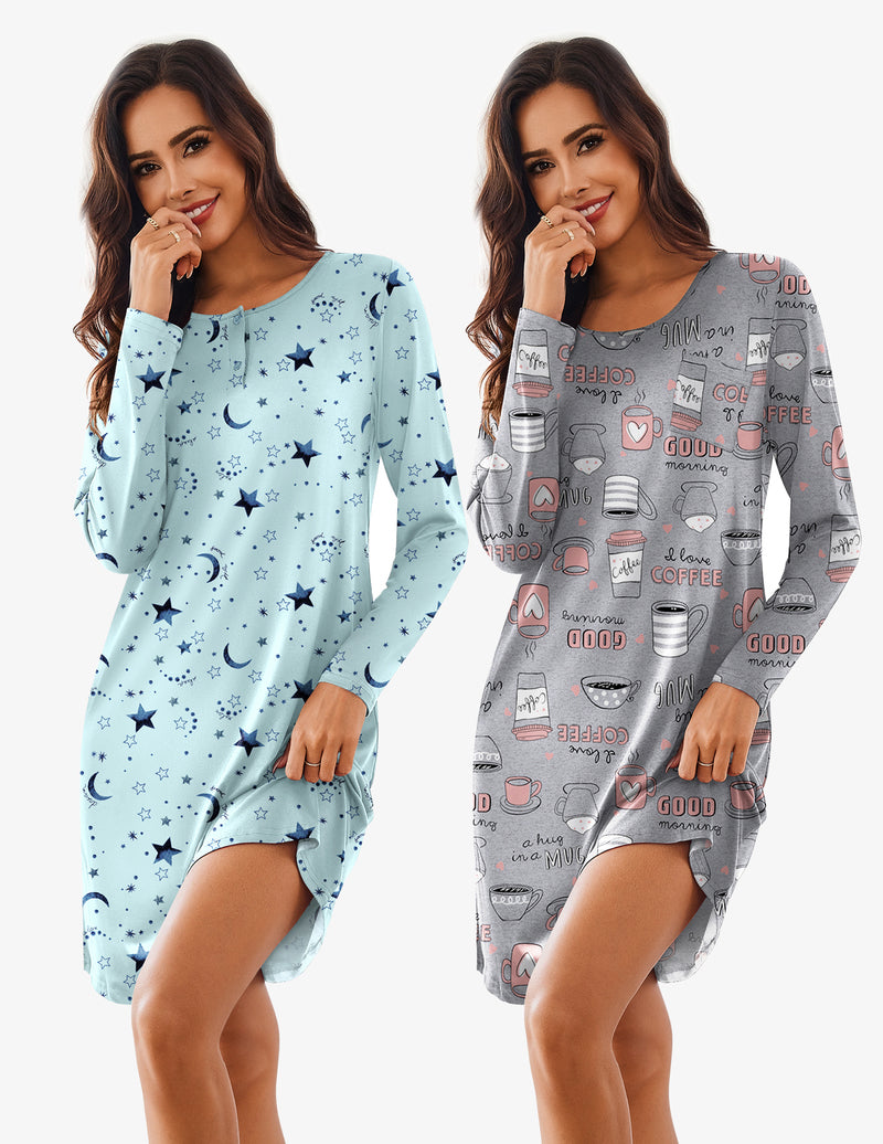 • Features: Sleep dresses feature a loose and roomy design in jersey knit fabric with long sleeves. The nightgowns are designed with crewneck, kneen length. One of the nightshirt comes with chest pocket and the other comes with button design.