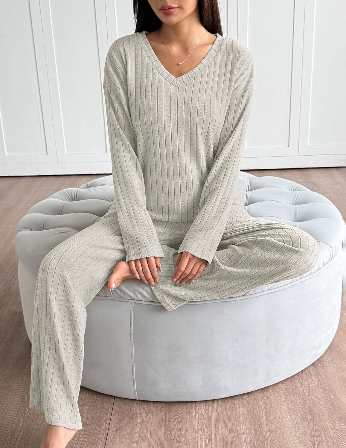 DESIGN: V neck,elastic waist,pockets.Knit fleece texture make these lounge sets comfortable.V neck long sleeve pajama tops and wide leg pants with pockets.2 piece loungewear set.
