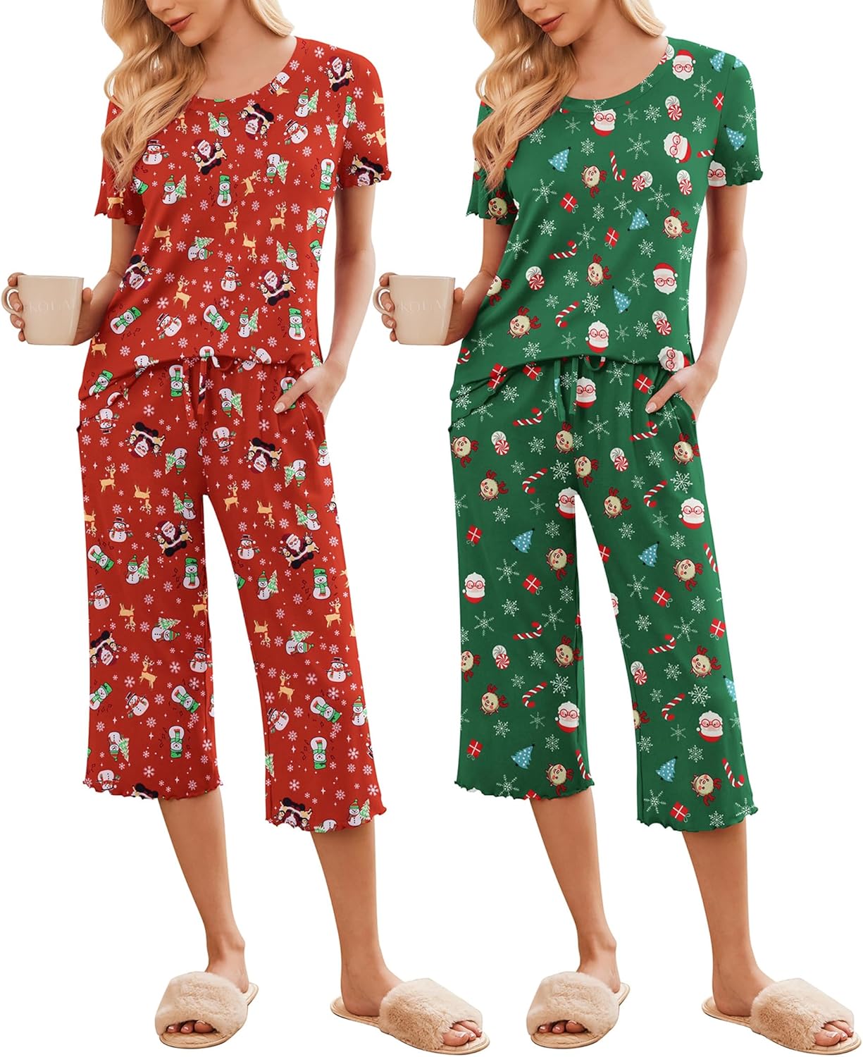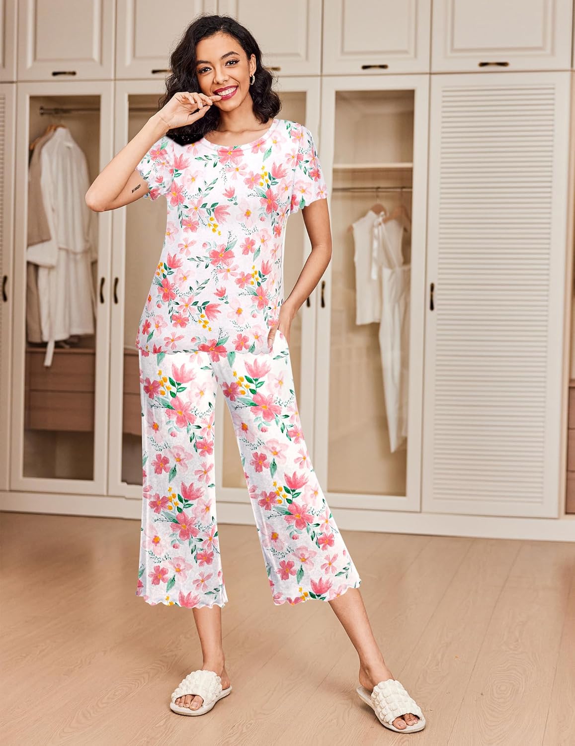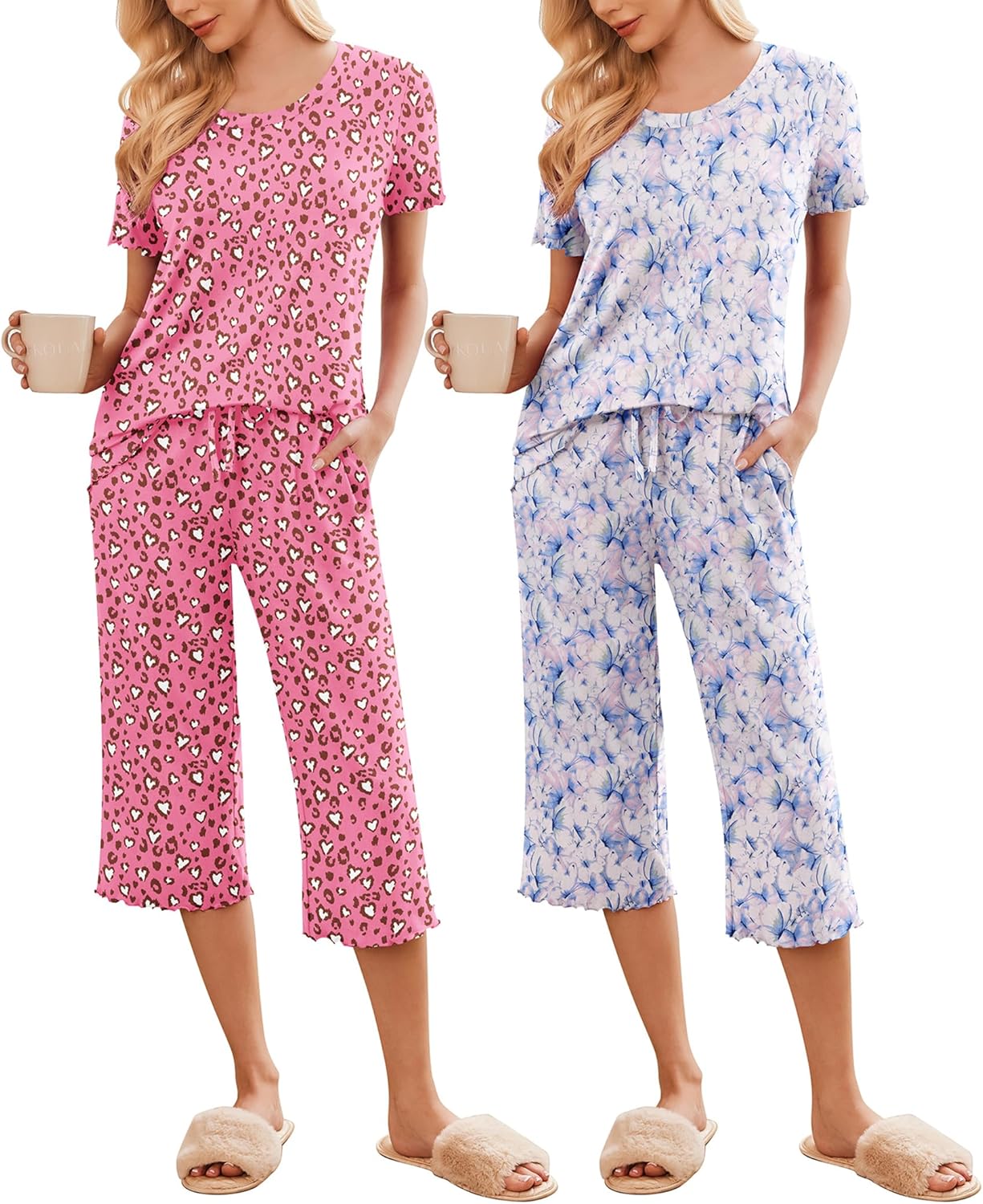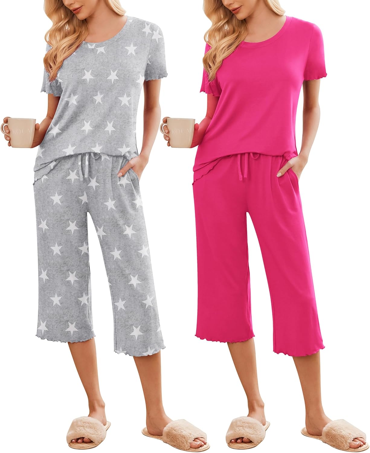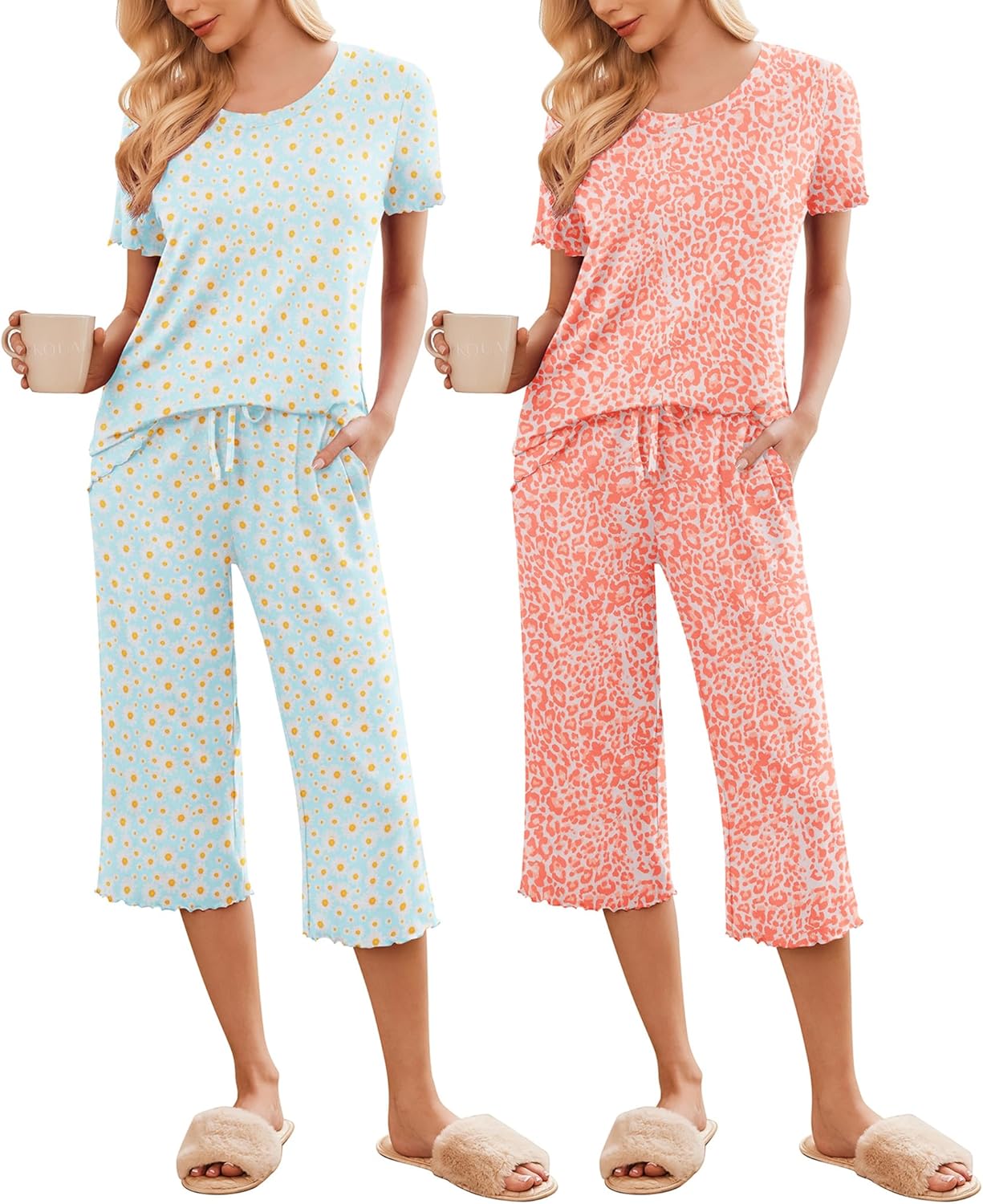 • Exquisite Design: The pajama top has a classic round collar and short sleeves, which is loose and comfortable, with wavy cuffs and trouser legs. The Capri pajama pants have an elastic waist and two large side pockets, casual and fashionable.