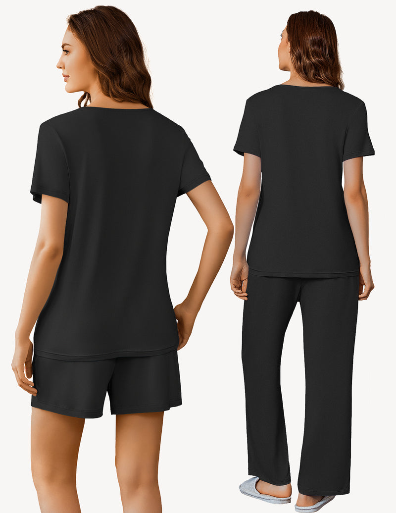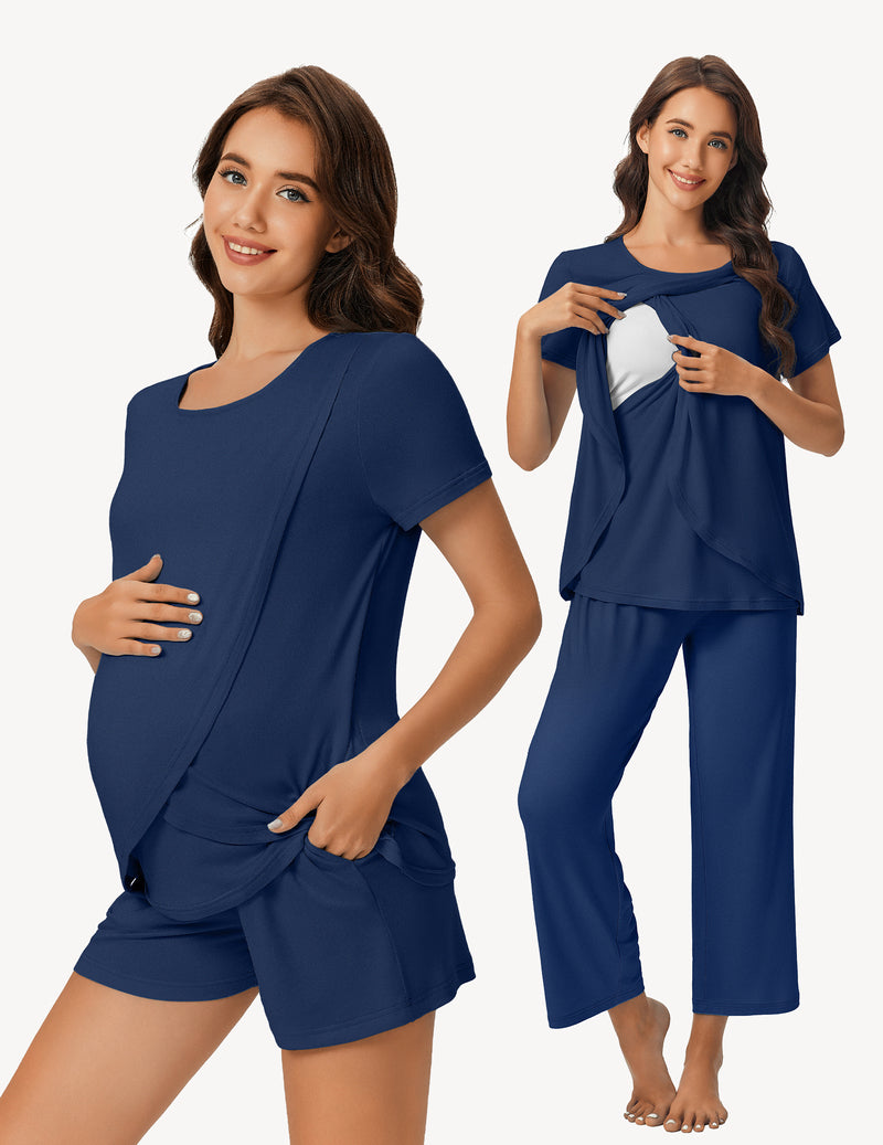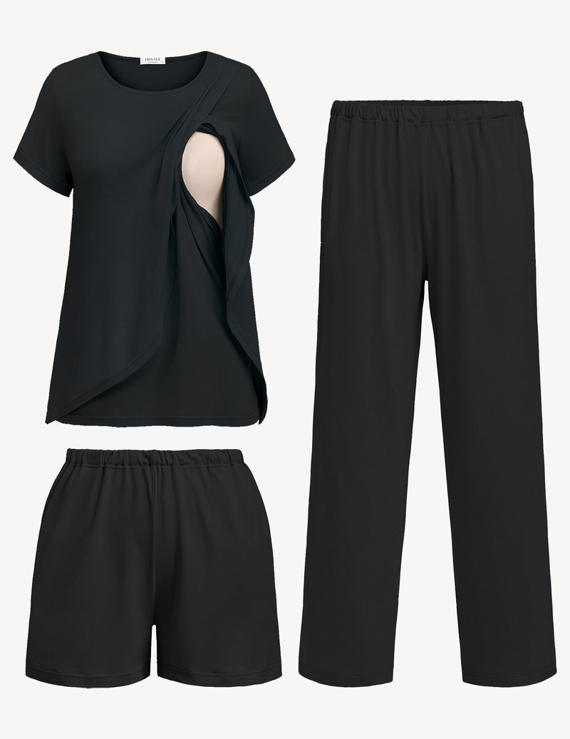 Three Piece Set: This 3-piece nursing pajamas set comprises 1 short sleeve breastfeeding top, 1 pair of maternity shorts, and 1 pair of pregnancy long pants. This breastfeeding pajamas set is designed to be worn throughout the year, making it perfect for spring, summer, fall, and winter.