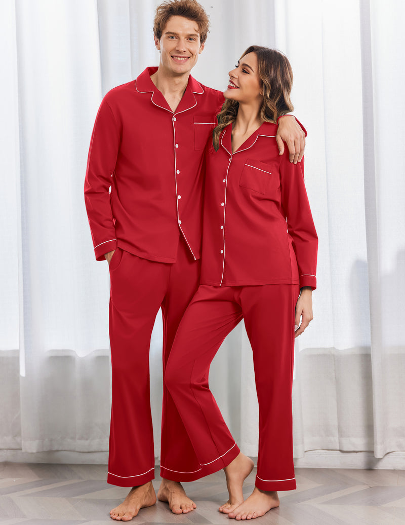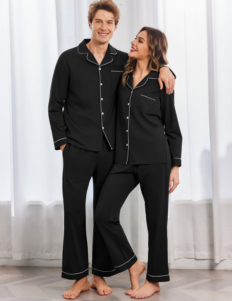 Elegant Design - Matching pajamas for couples features classic sleepwear style.Long sleeve,button down top with one chest pocket. Pajama pants with drawstring elastic waist ensure a flattering fit, and two side pockets for convenience. Coordinated pjs sets for him & her with contrasting piping of cuffs and hem for durability and polished look