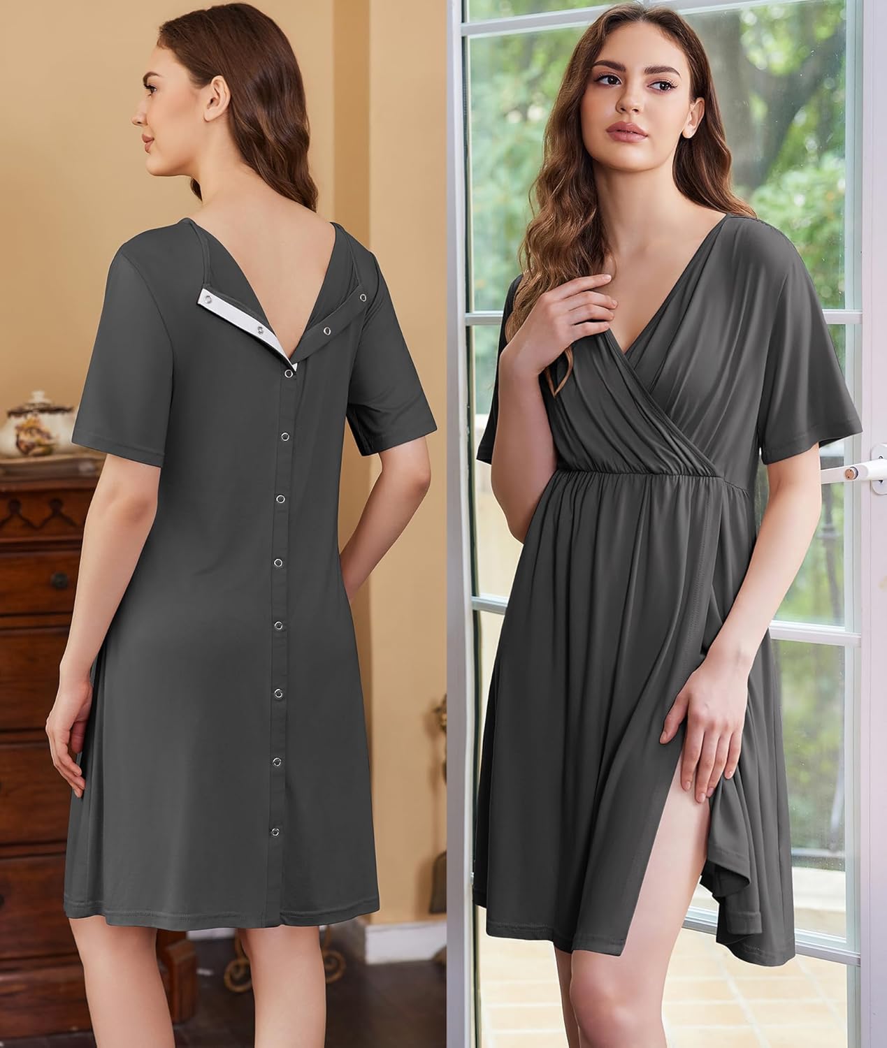 • Function Maternity Hospital Gown: Button closure at back openings allows for easy epidural placement, split front flap allows for fetal monitoring, ultrasounds, c-section incision inspections, and skin-to-skin contact, it also an excellent choice for labor and delivery, also can be used as a casual pajama dress or maternity nursing nightdress, it's going to make nursing a breeze.