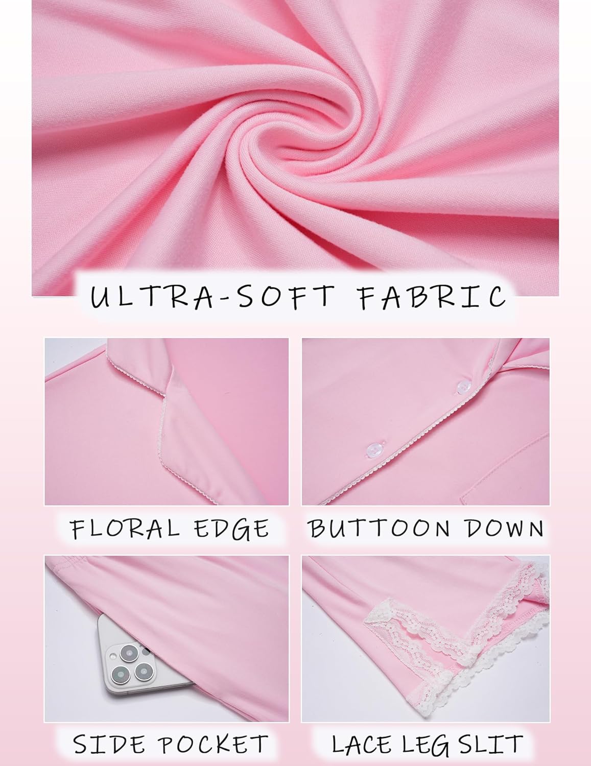 FEATURES: The soft nightwear stands out with its lace-trimmed pocket on top,cuffs and slit trouser legs, adding a delicate elegance.The contrasting button color and floral edge enhance the visual appeal, bringing a lively touch to stylish.