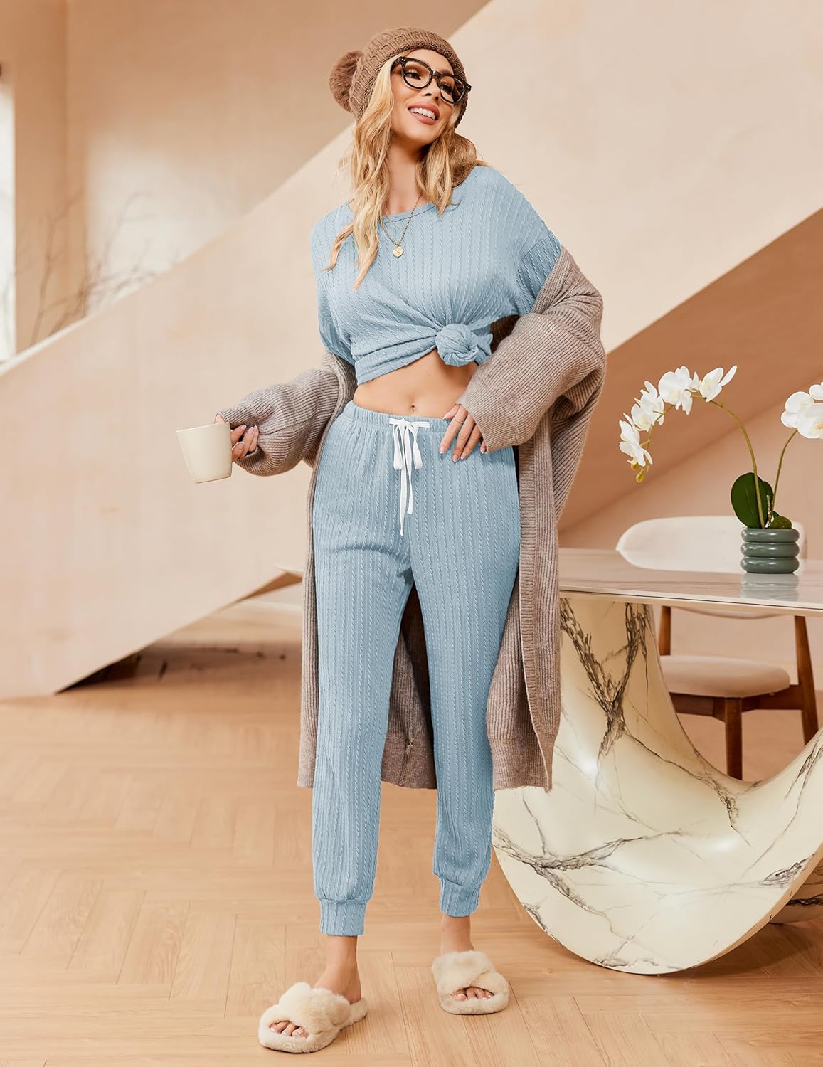 Ribbed Knit Long Sleeve Pullover Top Jogger Pants Set