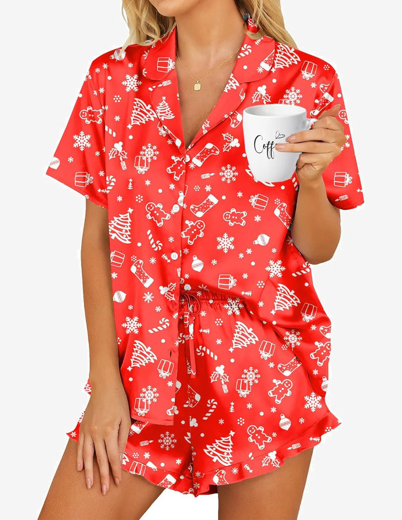 • Unique Fashion Designed: 2 Piece Satin Pajama Set Featuring Relaxed Style, Short Sleeve, Classic Notch Collar, Full Button Design is easy to put on and take off. Cute Print Pj Set With Elastic Waist Contrast Trim Pajama Shorts will give you more comfortable and freendom feeling when you wear it.