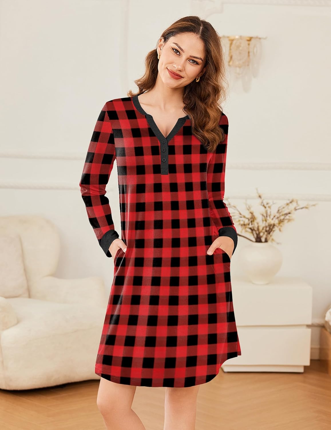 Long Sleeve Full Length Plaid Sleepwear With Pockets