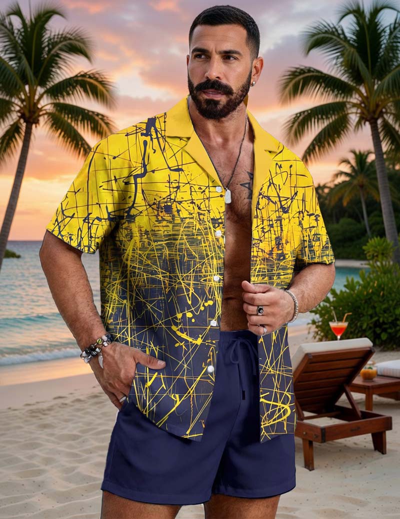 Men's Hawaiian Shirt and Shorts Set Abstract Wave Print Outfit